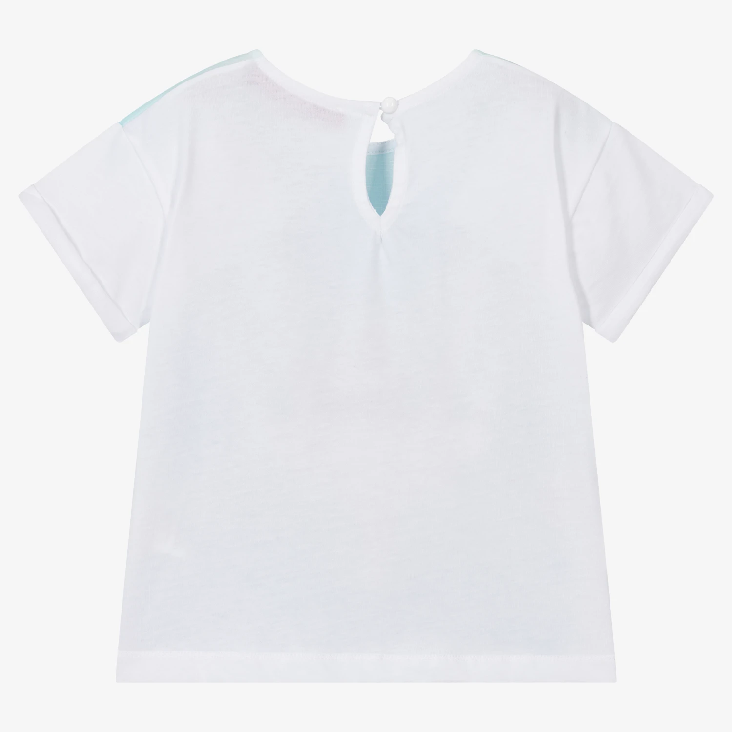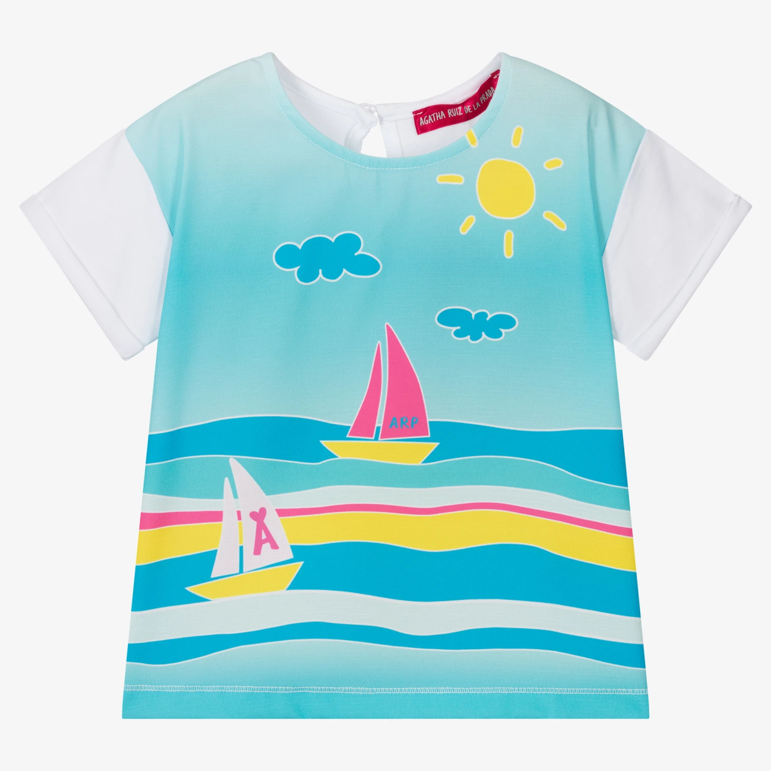 White and blue T-shirt for girls by Agatha Ruiz de la Prada. Made in a soft and lightweight crêpe, the front has a playful sailing ship graphic, detailed with the brand’s monogram and logo for a subtle designer touch. The back is made from a soft, comfortable cotton jersey, with a single button fastening.