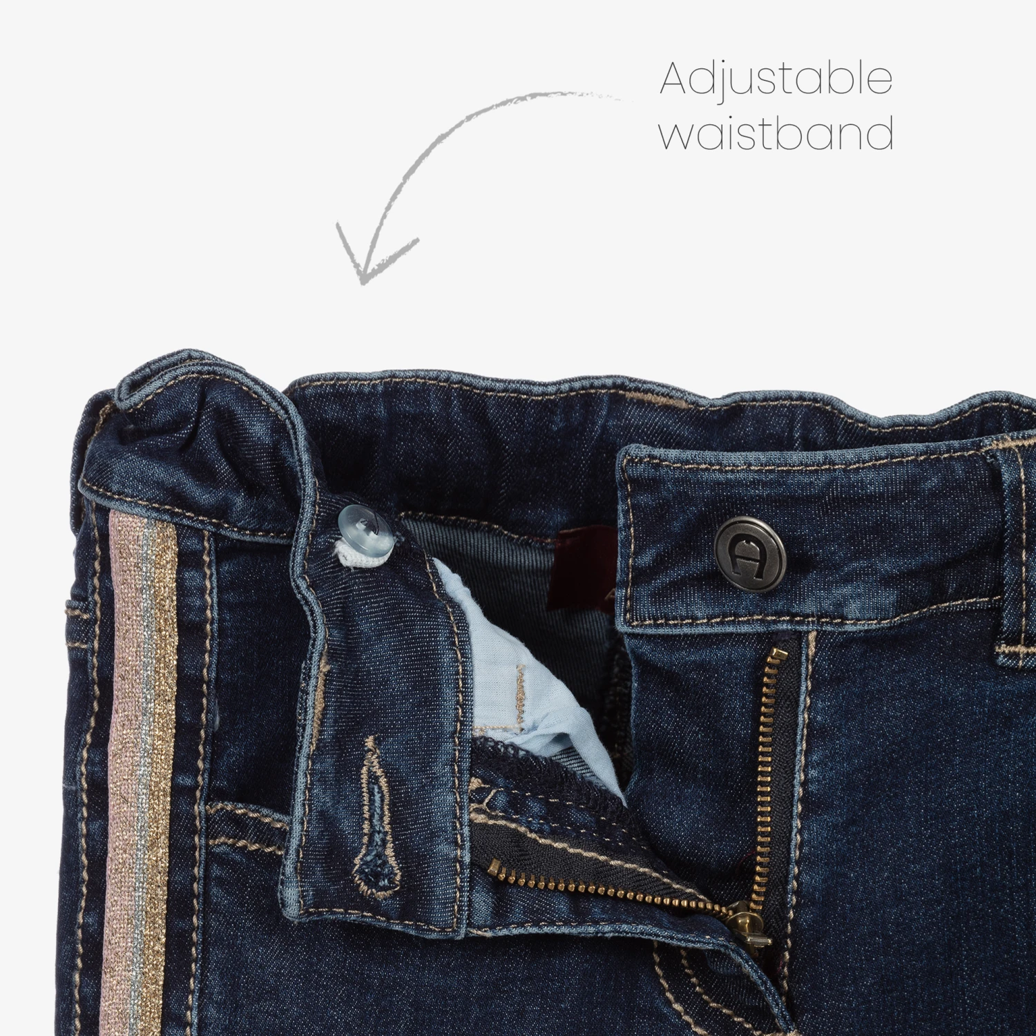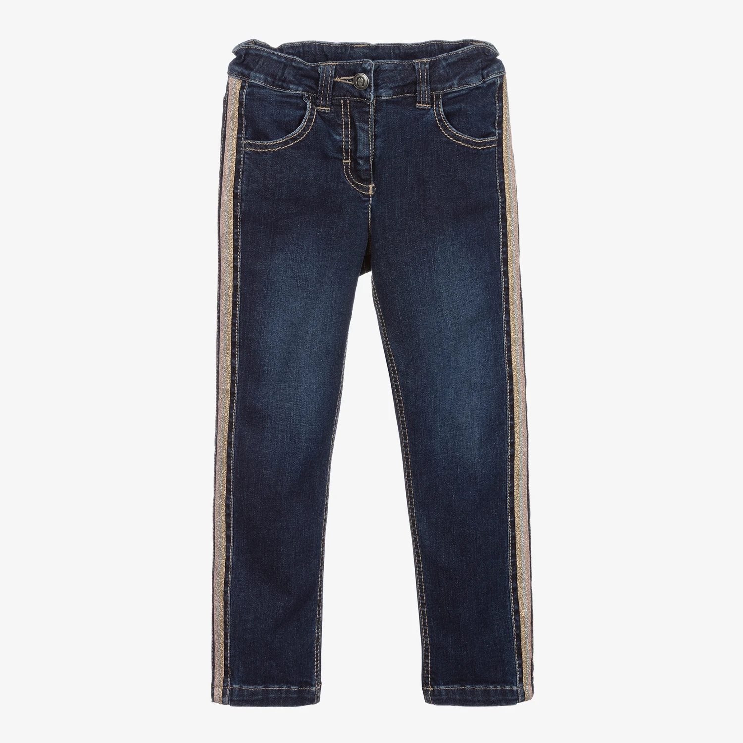 Girls blue jeans by AIGNER, with gold, silver and pink glitter tape on the outer seam. They are soft and stretchy, and the adjustable waist fastens with a zip and button. There is a signature ‘A’ horseshoe logo on the back pocket, embroidered in gold.