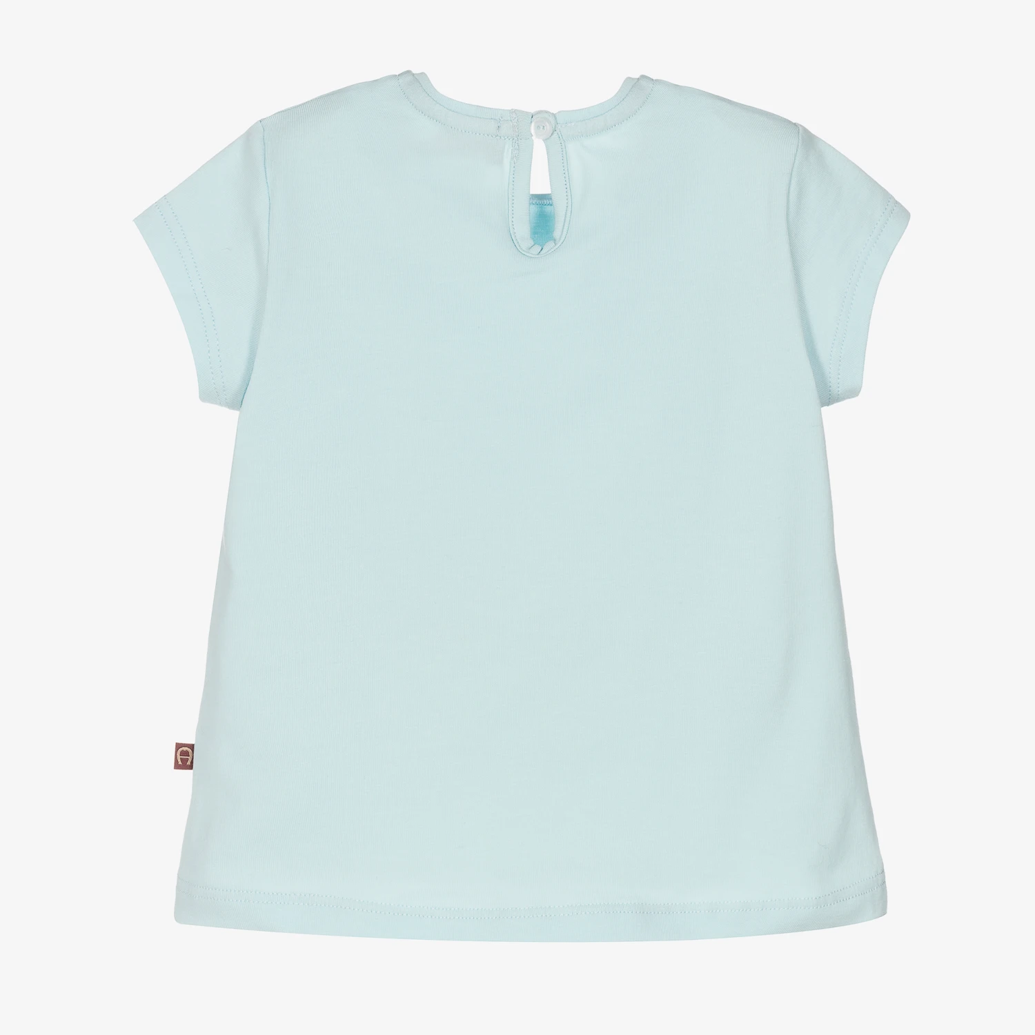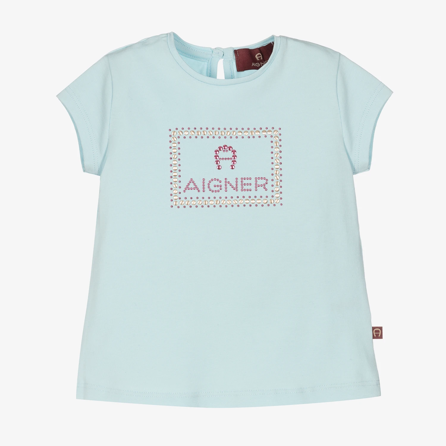 Pale blue cotton T-shirt for little girls from AIGNER, made in soft and comfortable jersey. It features cute capped sleeves and showcases an attractive logo design on the front, using pink and gold studs, with the signature ‘A’ horseshoe motif. To complete the look, the designer’s logo tab can be seen on the side seam and there is a stylish keyhole button fastening on the back.