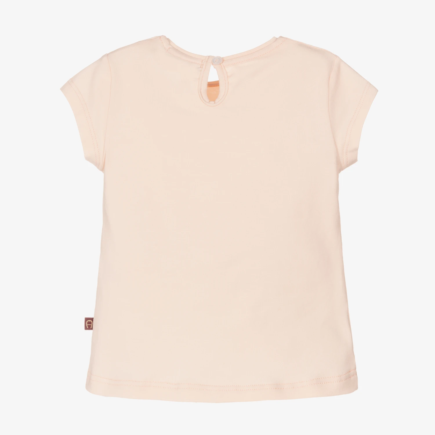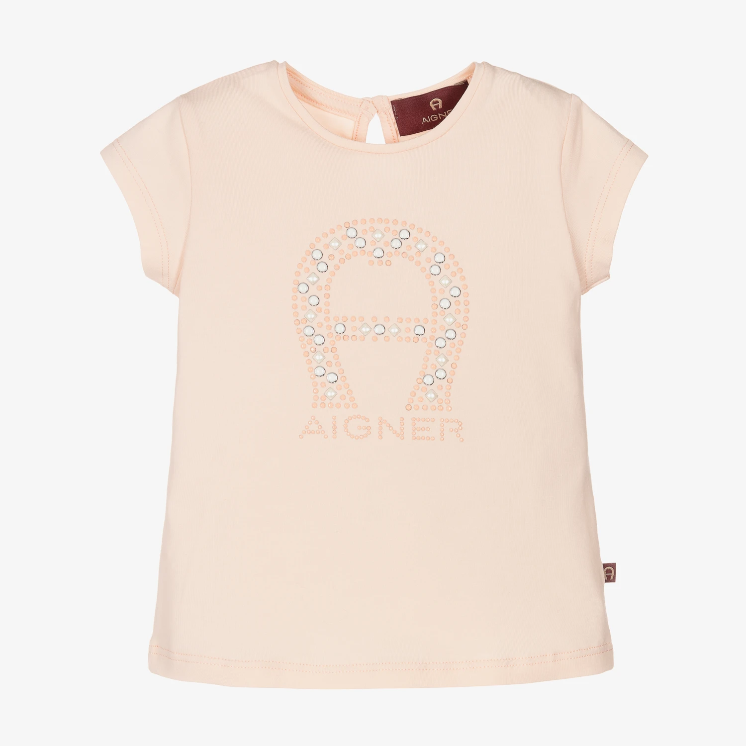Pastel pink T-shirt for little girls by AIGNER, made in comfortable cotton jersey. It features cute capped sleeves and showcases an attractive logo design on the front, using pink, white and pearly studs, with the signature ‘A’ horseshoe motif. To complete the look, the designer’s logo tab can be seen on the side seam and there is a stylish keyhole button fastening on the back.