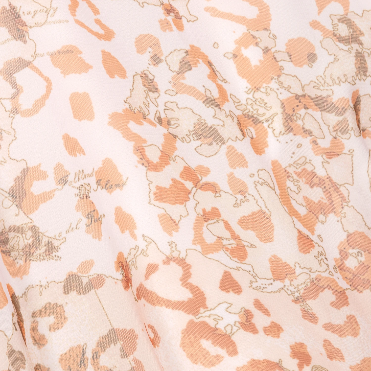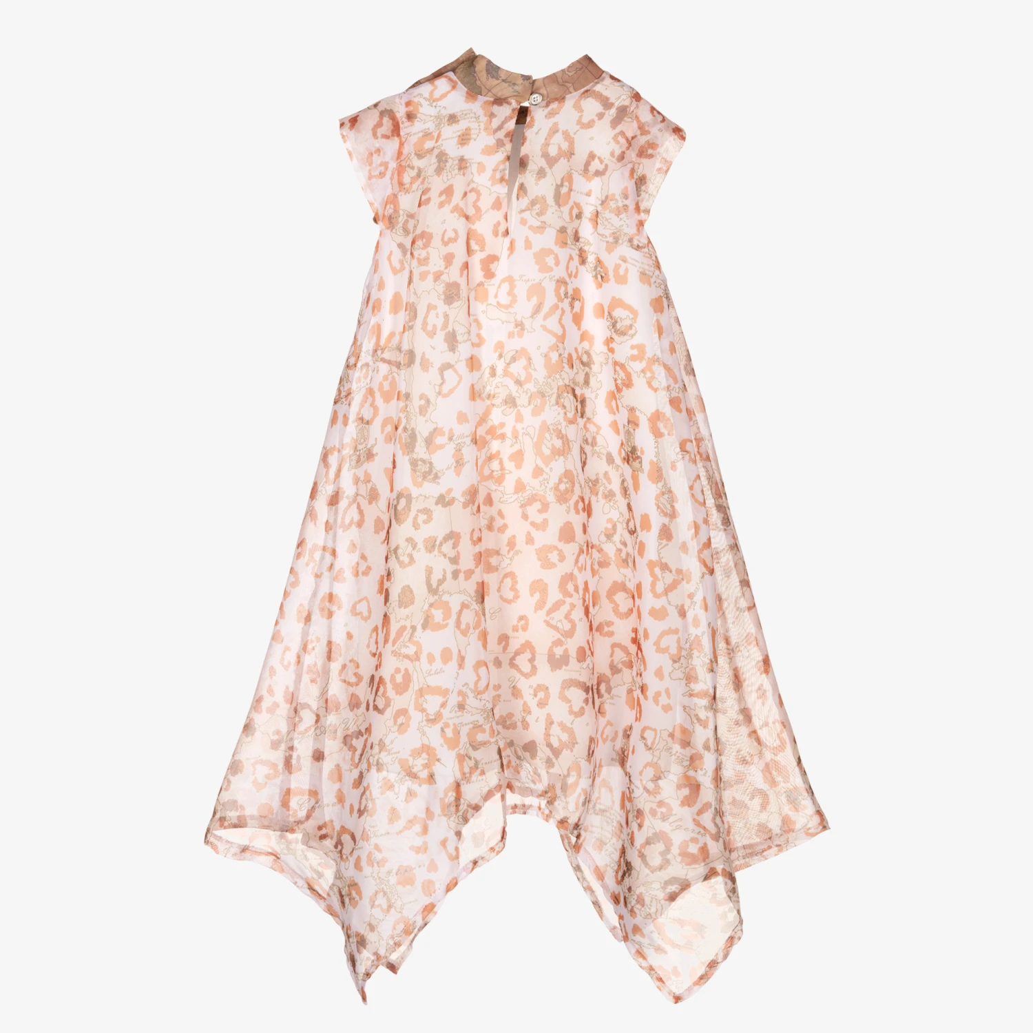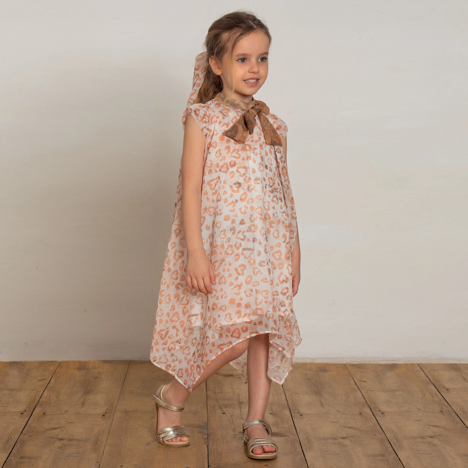 Gorgeous chiffon dress by Alviero Martini for girls. Floaty and lightweight, the style is sleeveless with a dark beige Geo map bow stitched at the side. The light beige Geo map overlay has a leopard print and asymmetric handkerchief hems which are longer at the sides. It is fully lined in cotton voile and has a single button fastening on the back.