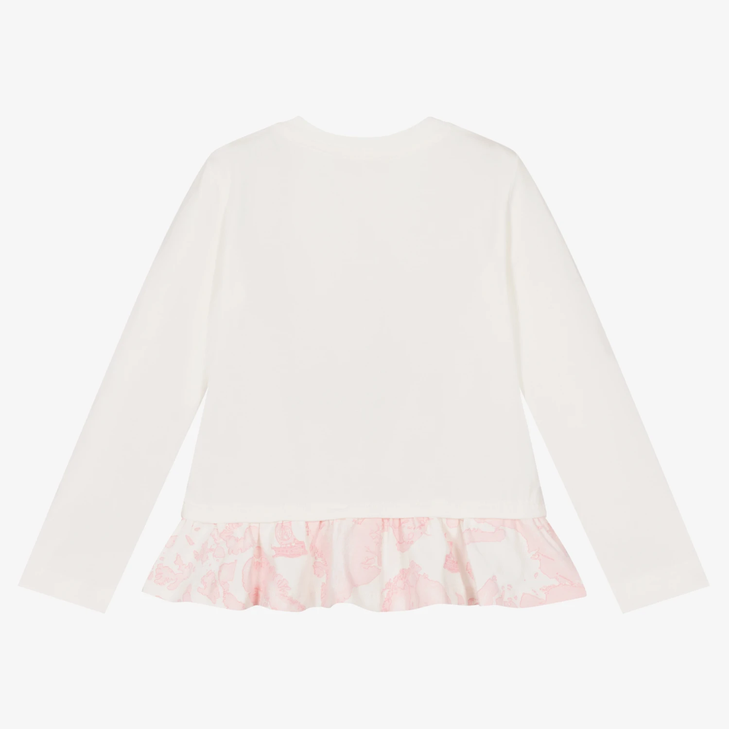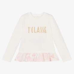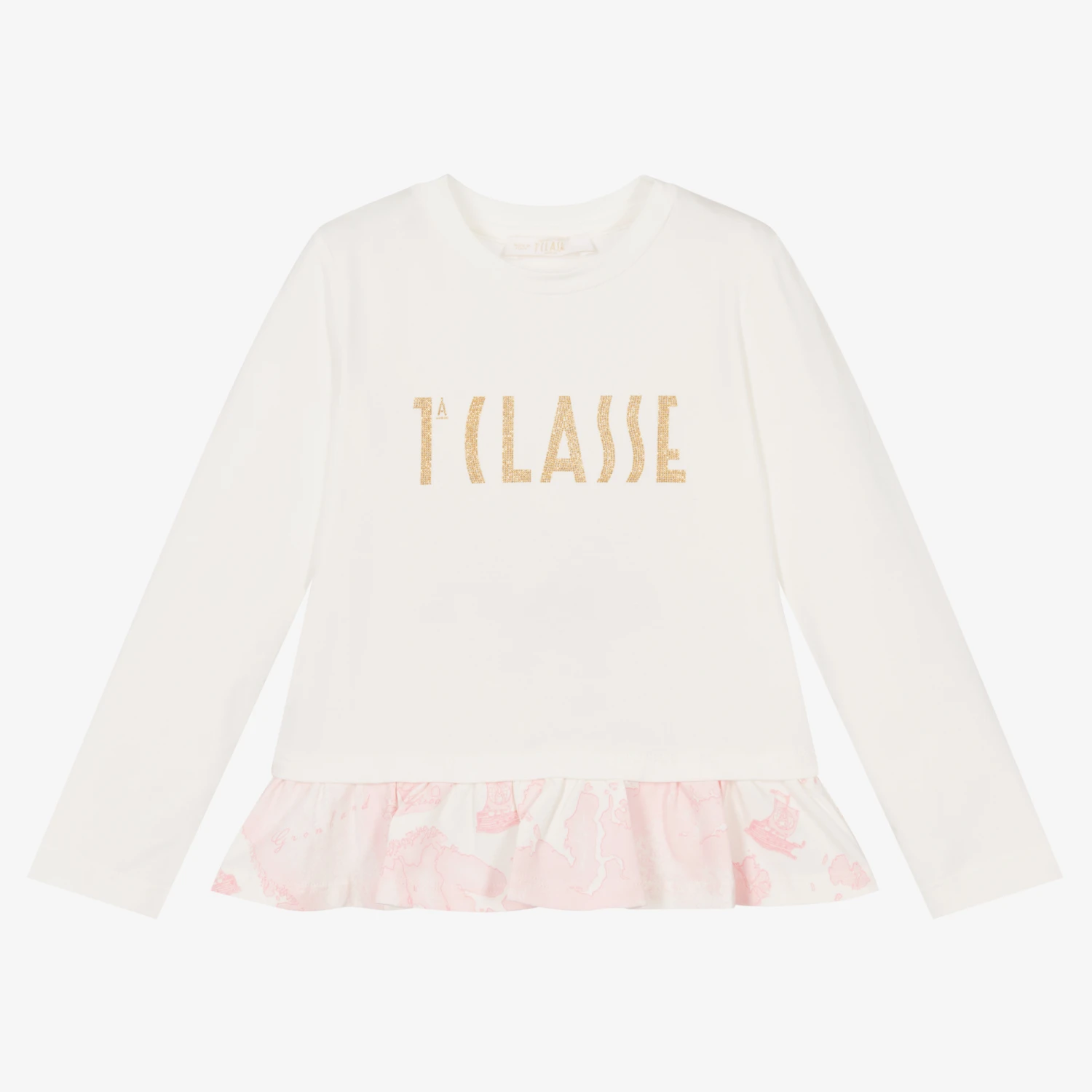 Lovely for girls, a pale ivory top by luxury Italian brand Alviero Martini. The front has an eye catching 1a Classe logo in sparkly gold, with a pretty ruffle hem in a pink Geo map print. Easy and comfortable to wear, it is made in soft and stretchy cotton jersey.