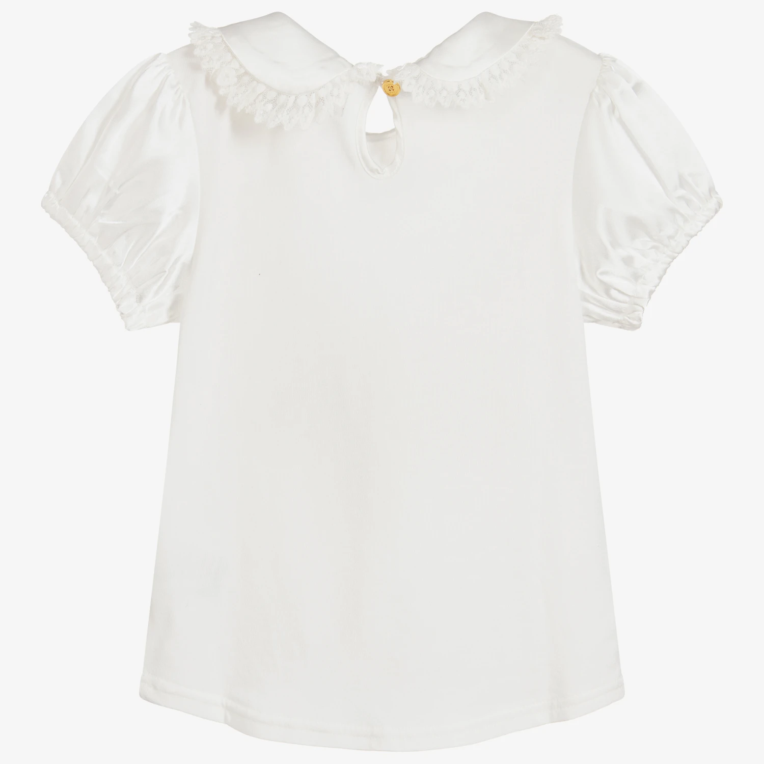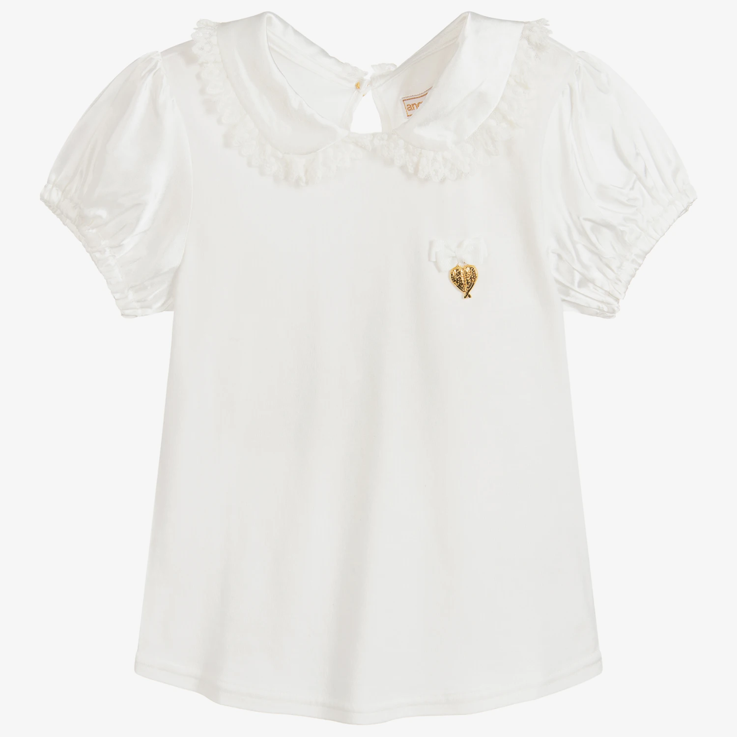 A pretty off-white top for girls from Angel’s Face, made in soft cotton and modal blend jersey. It has satin gathered sleeves and collar trimmed with lace that fastens on the back with a gold branded button. The signature gold heart logo charm and bow is on the chest.