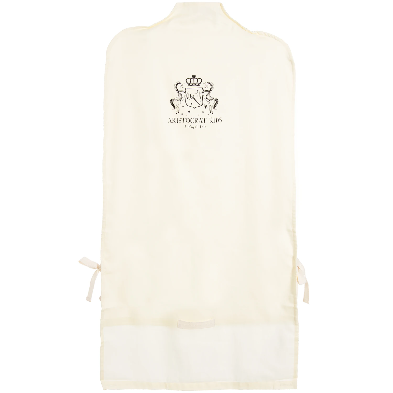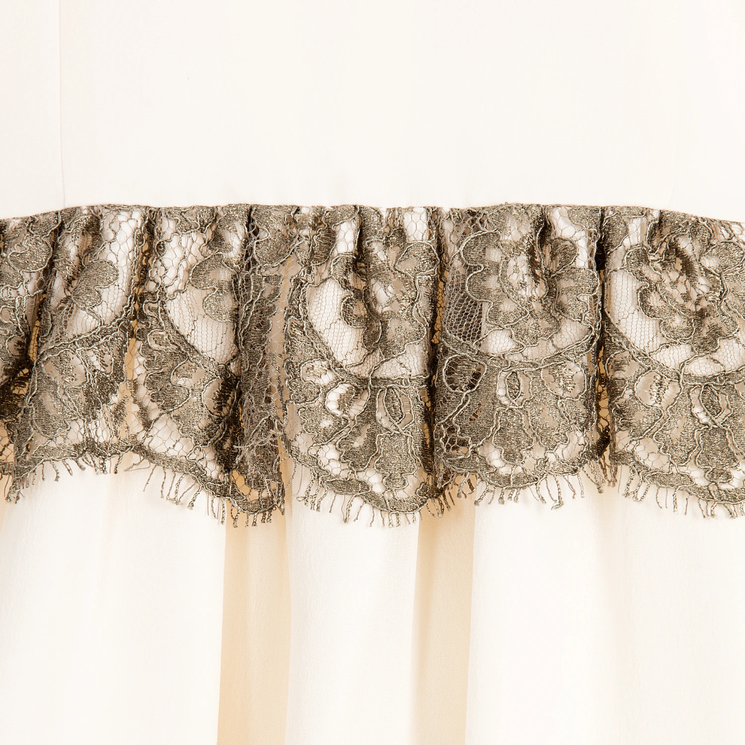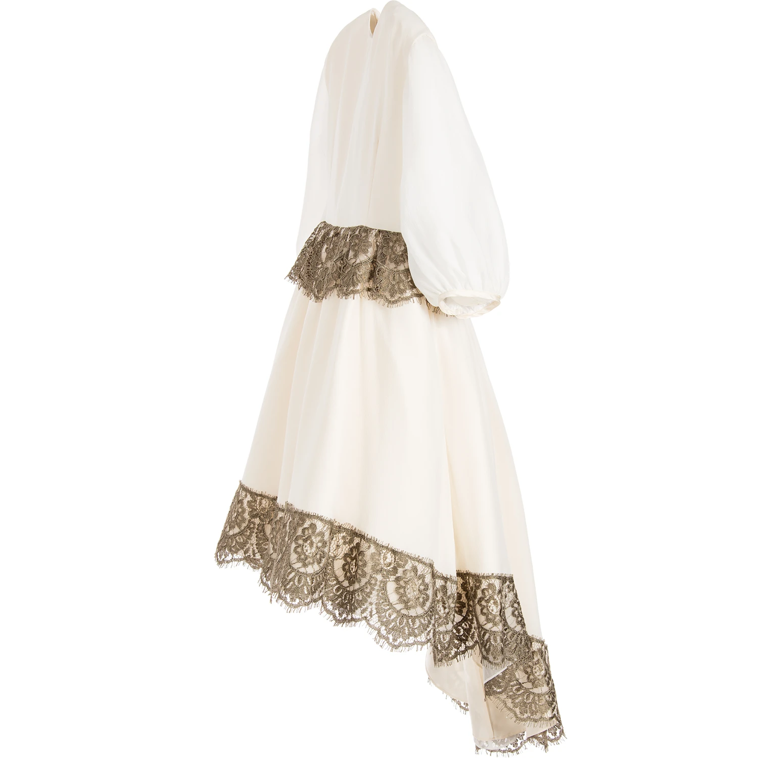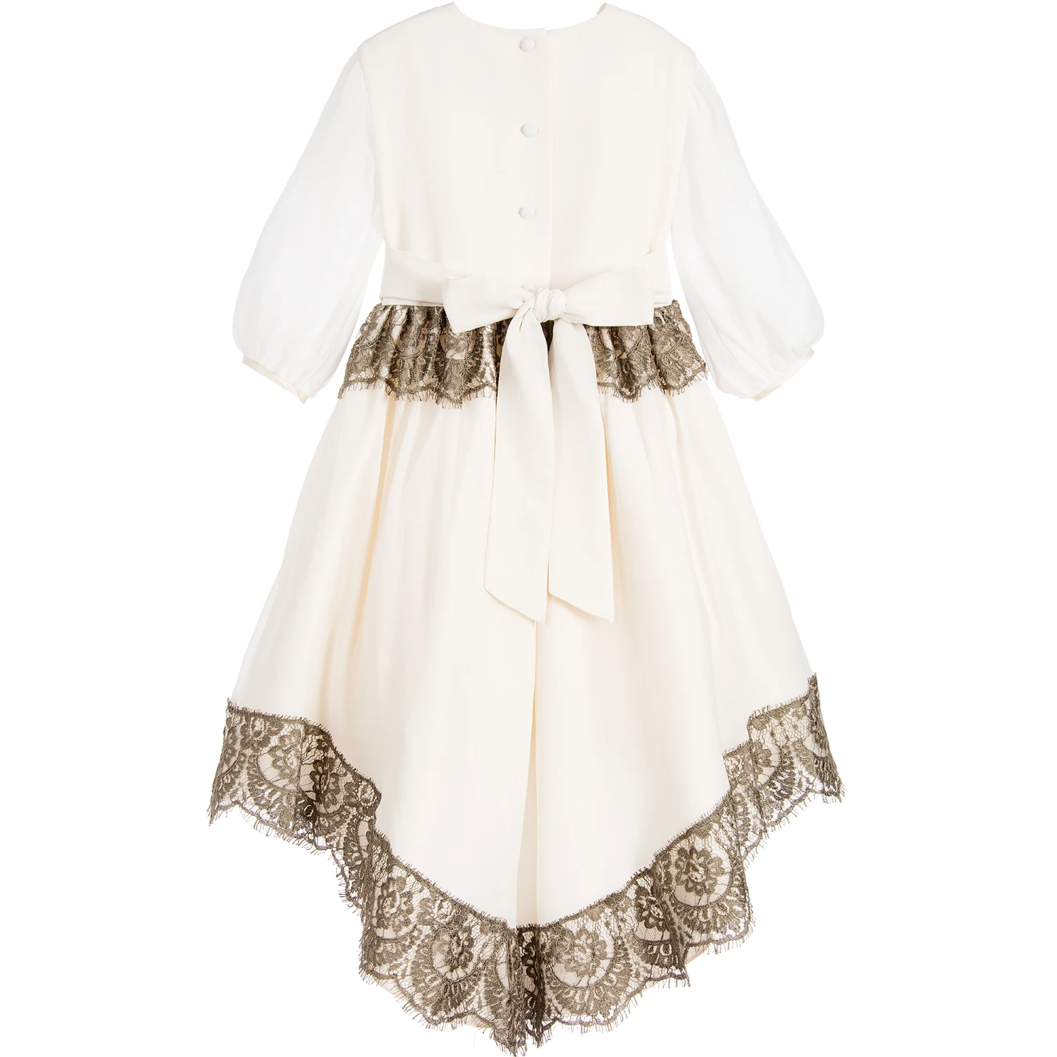 Girls luxurious, handmade ivory dress by Aristocrat Kids. Made from a layer of beautiful silk georgette, with sheer sleeves and fabric covered button fastenings. It has a fitted bodice, a full and voluminous skirt, with an under-layer of silk taffeta and tulle frills attached to the smooth cotton lining. It has a bronze lace trimmed waist with a sash to tie on the back.