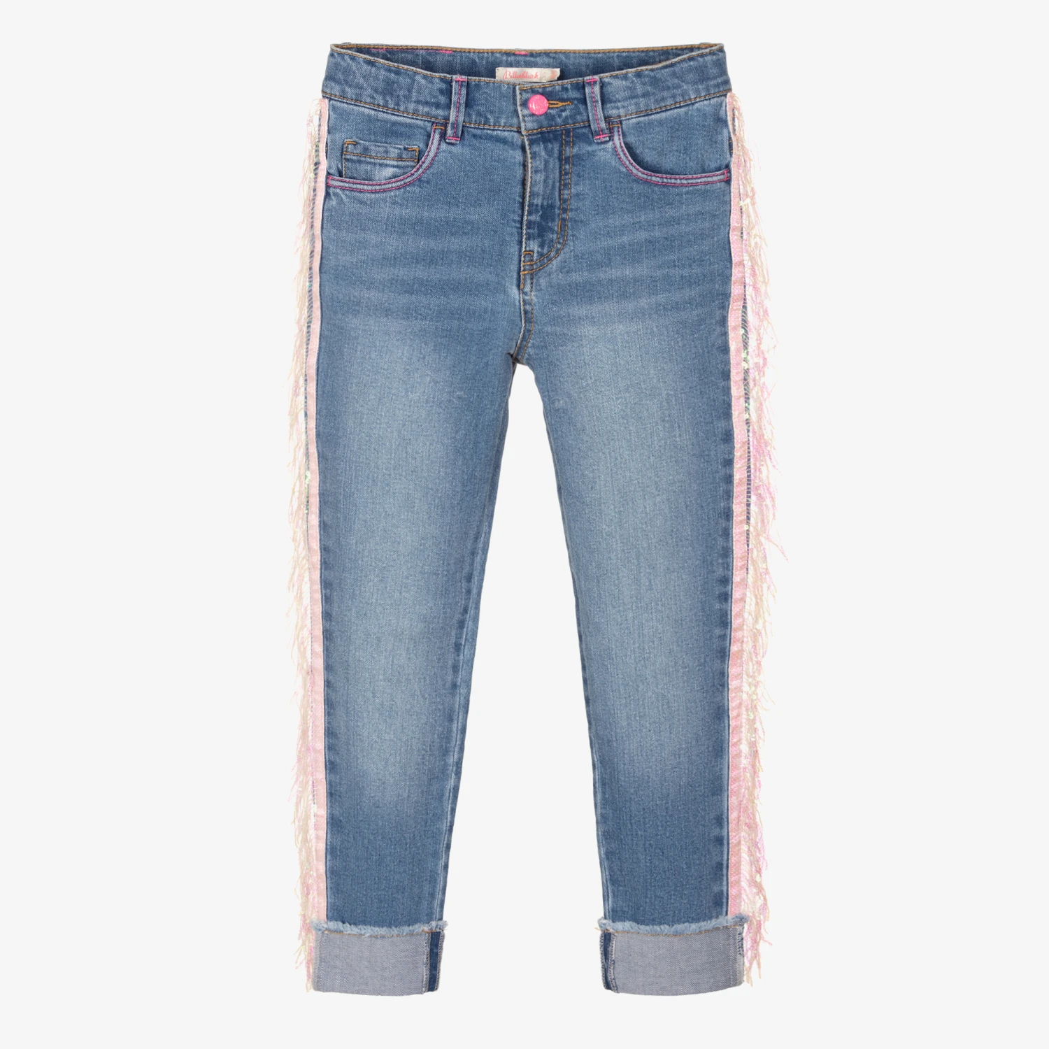 Cool mid-blue skinny jeans for girls by Billieblush, with stunning pink sequin fringing on the sides. In a classic five pocket style, they have heart embroidery on the back and a glittery logo tab on the back waistband. There are stitched in turn-ups on the ankle cuffs, with stylish frayed hems. Fastening with a zip and popper, they have an adjustable waist for a good fit.