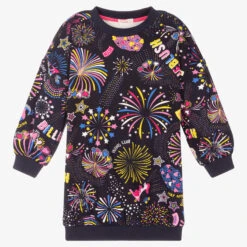 Navy blue sweatshirt dress for girls by Billieblush, made in soft cotton jersey. It has a fun, multicoloured print of fireworks, stars and hearts along with the brand’s logo.