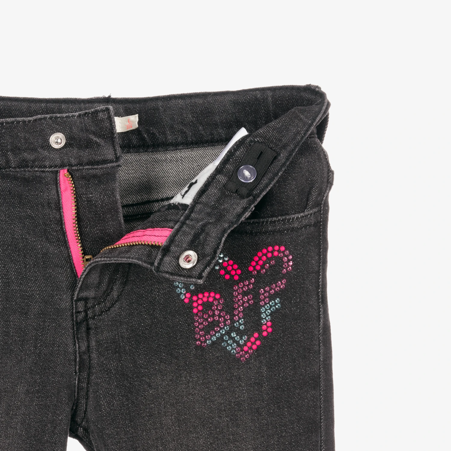 Washed black jeans for girls by Billieblush, made in soft cotton denim. With a cool, flared cut, they are trimmed with a diamanté heart and glittery rubberised logo badge on the back of the waistband. They have five pockets, a useful adjustable waist and a pink front popper and zip fastening.
