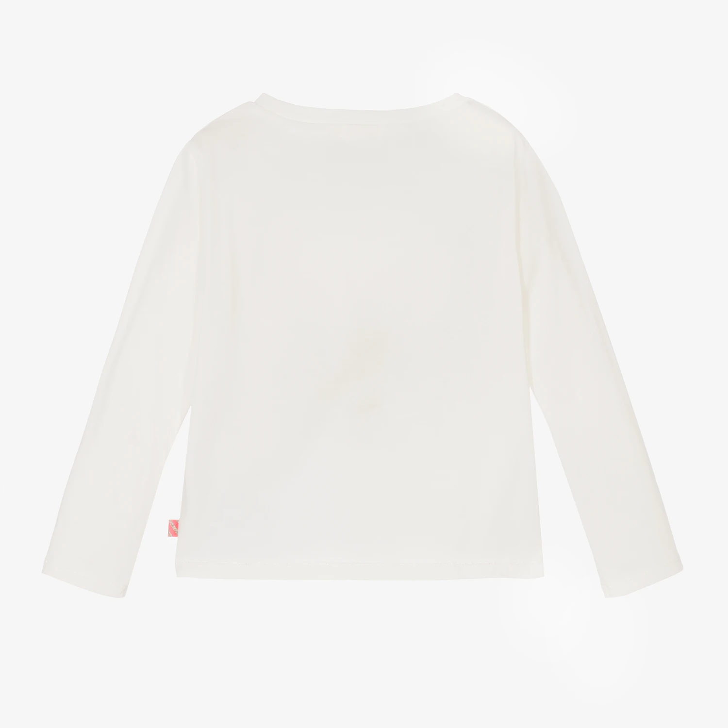 Pretty ivory cotton top for girls by Billieblush, shimmering with sequinned unicorns in pink, blue and gold. With glittery pink detailing and iridescent stitching, it is made in comfortable jersey for all-day fun.