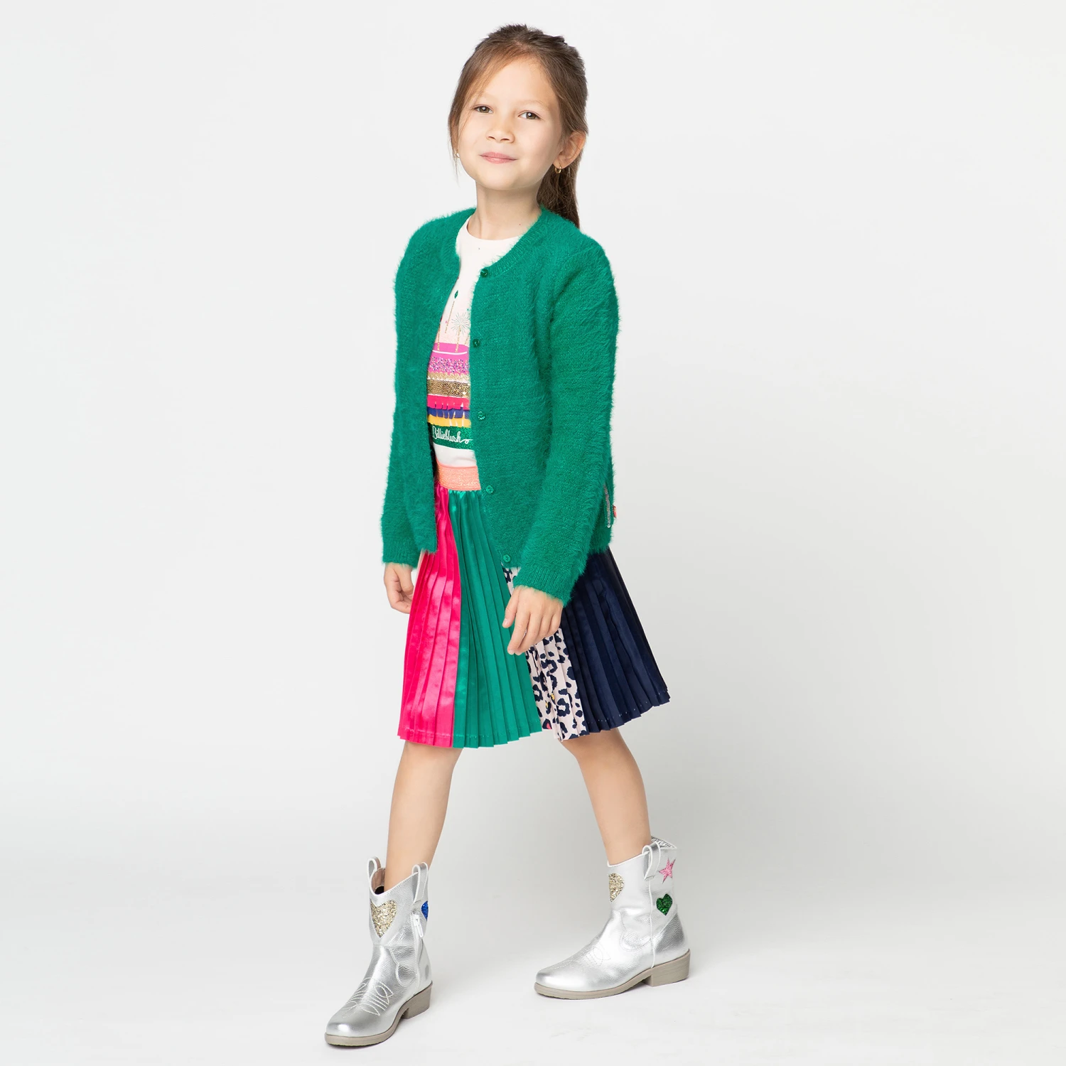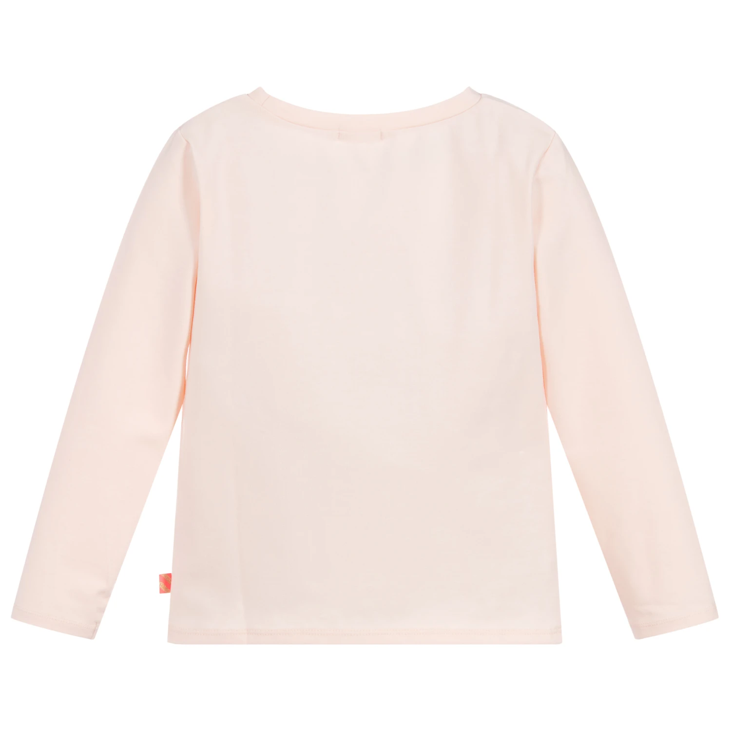 A pretty pink top for girls by Billieblush, made in a soft, stretchy polycotton jersey. It has a fun cake print on the front, in pink, glittery green and gold, with blue and pink fringed crêpe trims.