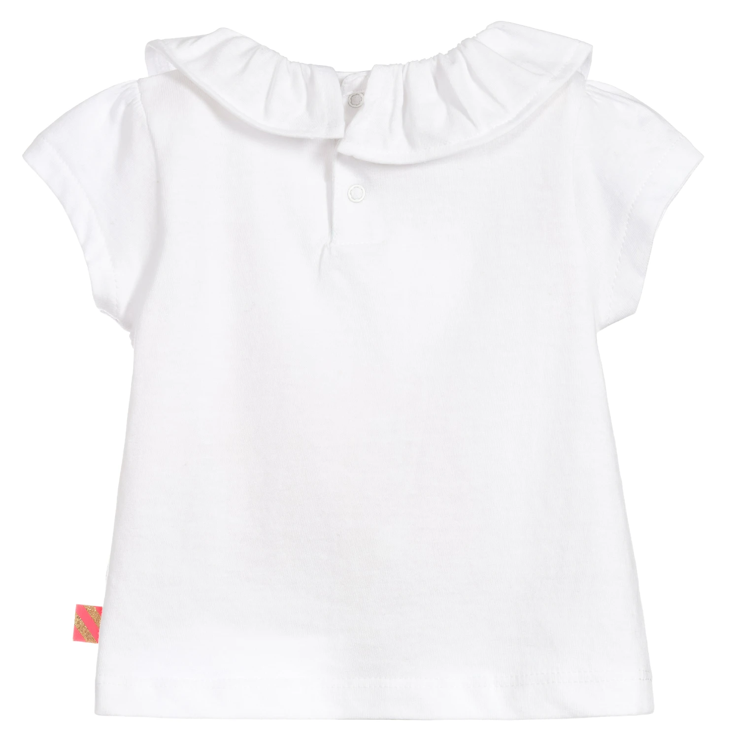 White T-shirt for younger girls by Billieblush. Made in comfortable cotton jersey, it has a ruffle collar and a rainbow print on the front in pink, yellow and turquoise blue, with glittery gold hearts. There are useful popper fastenings on the back.