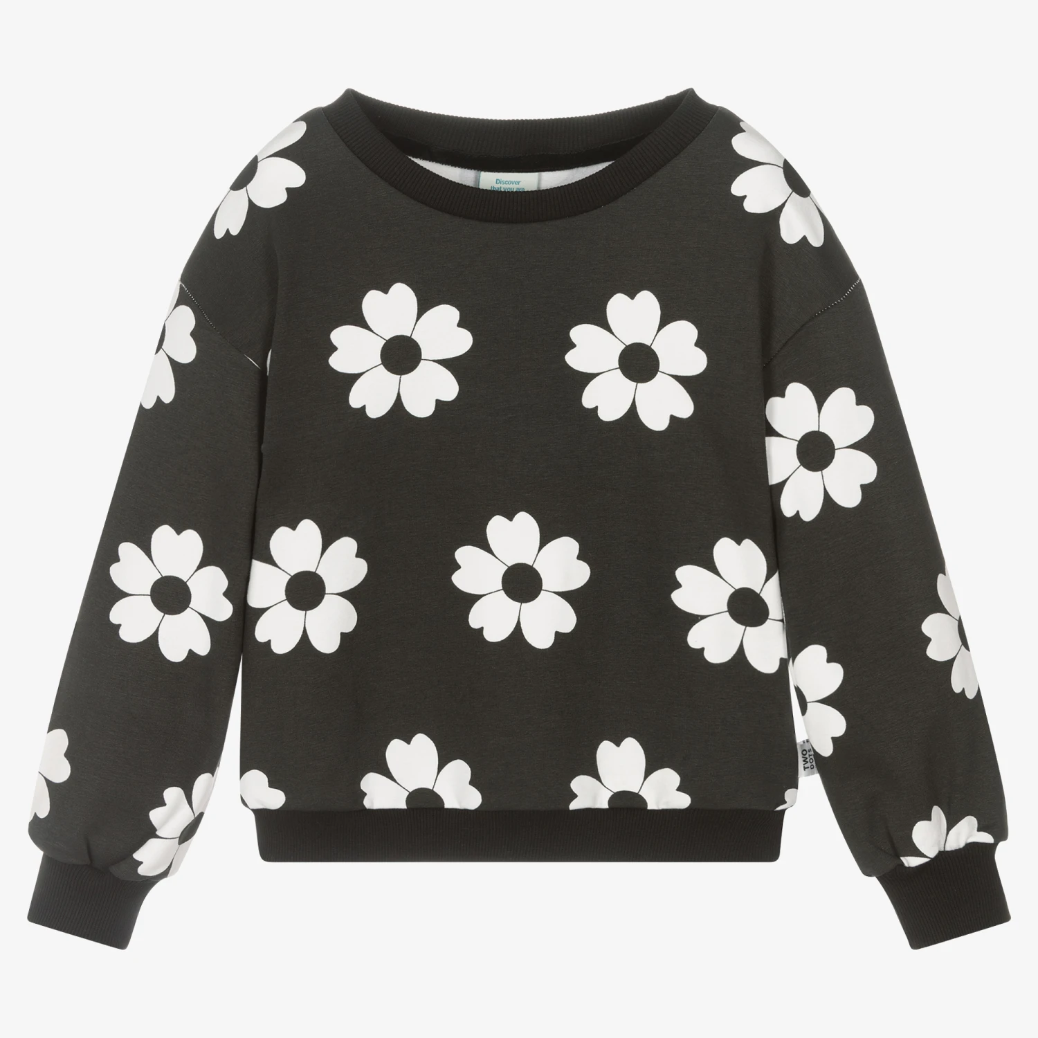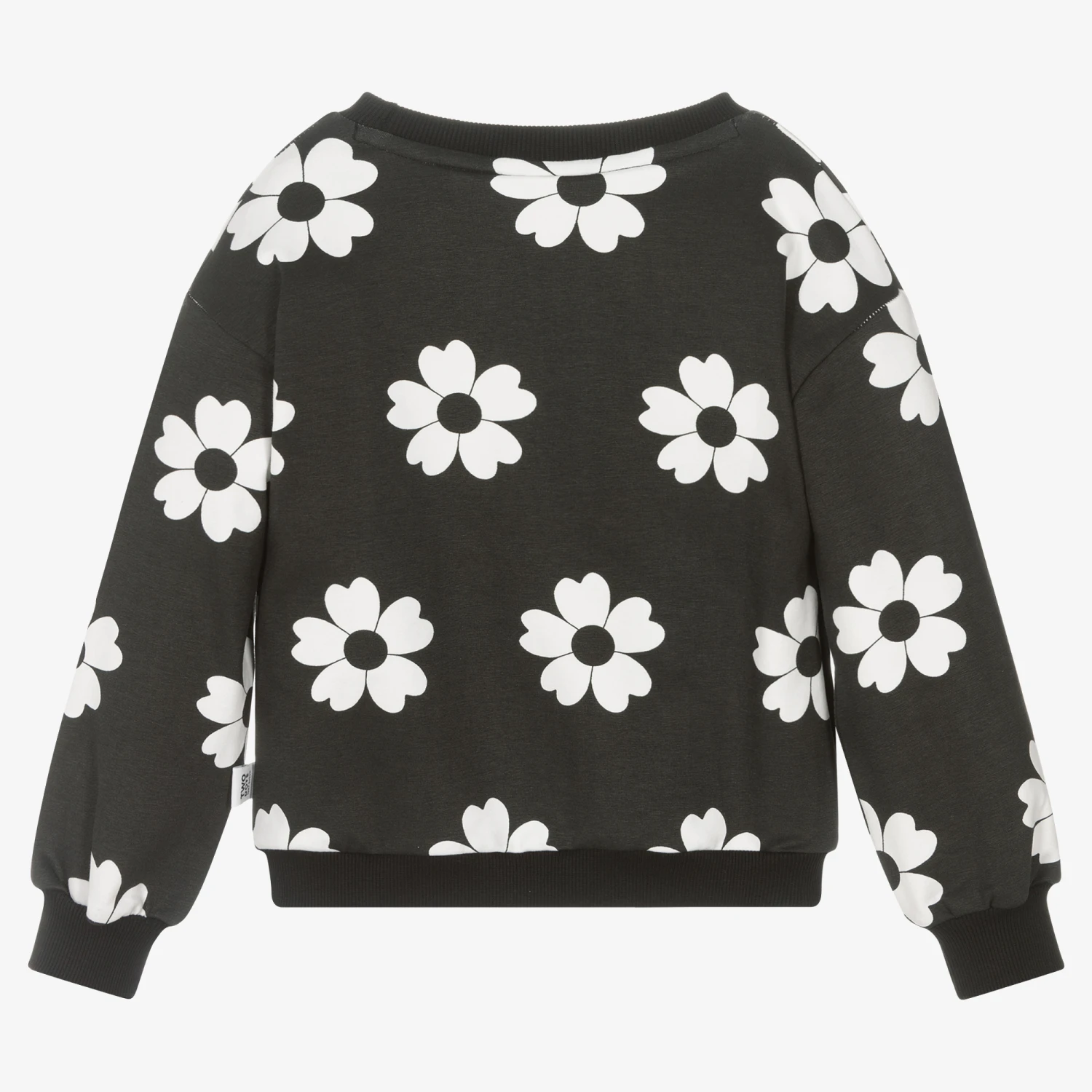 From Boboli, this washed black sweatshirt for girls is made in mid-weight cotton jersey. Complete with ribbed trims, this fun sweatshirt has an all-over white flower print.