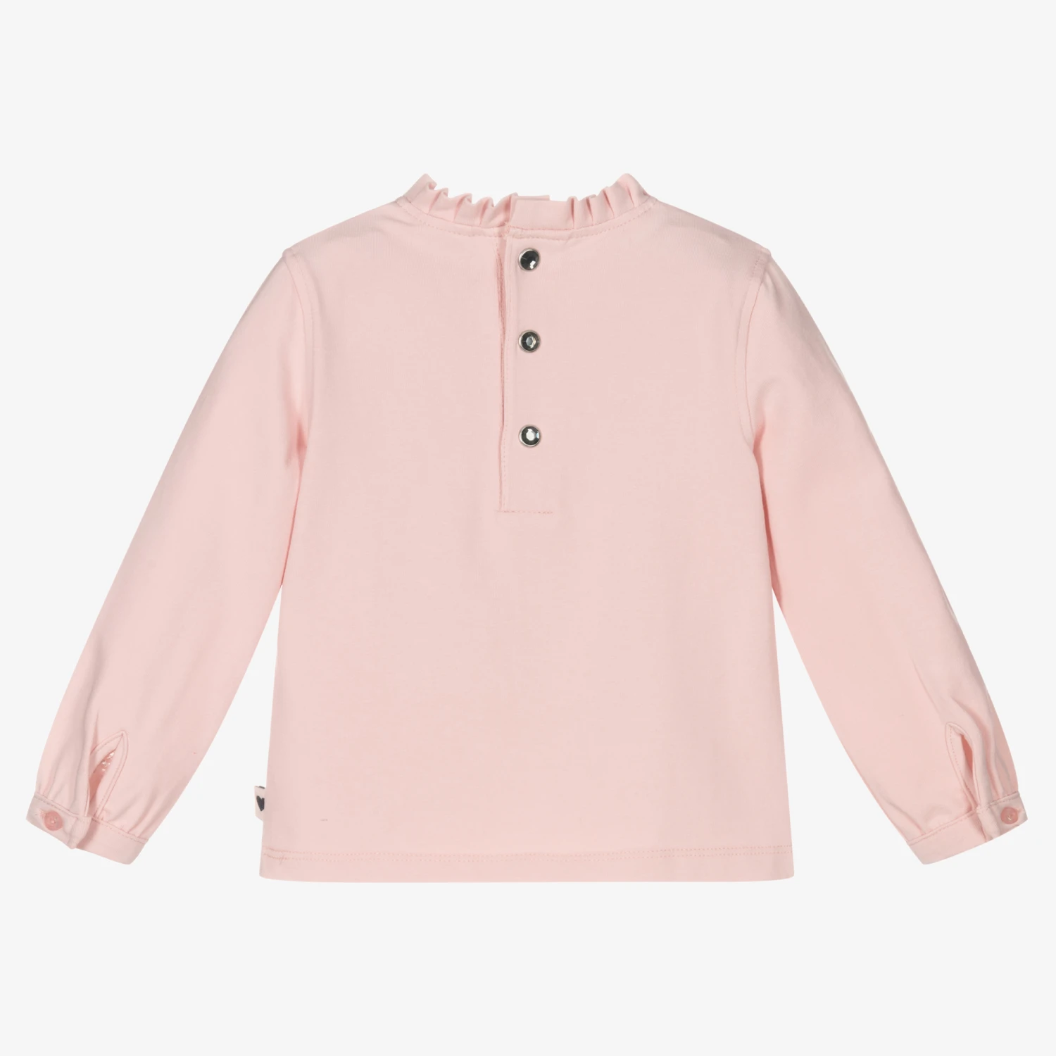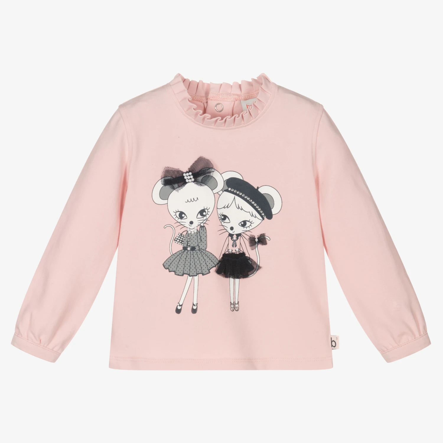 Long-sleeved pink top for girls by Boboli, made in soft and comfortable cotton jersey. It has a monochrome mouse print on the front, trimmed with black tulle, sparkly diamantés and pearls. A ruffled neckline, gathered cuffs and sparkly popper fastenings on the back add a stylish touch.