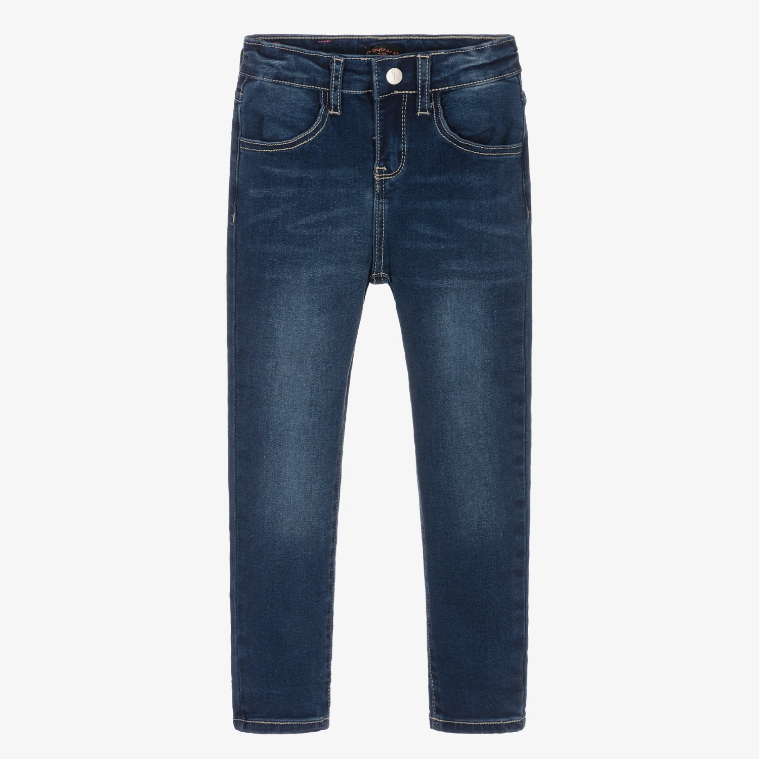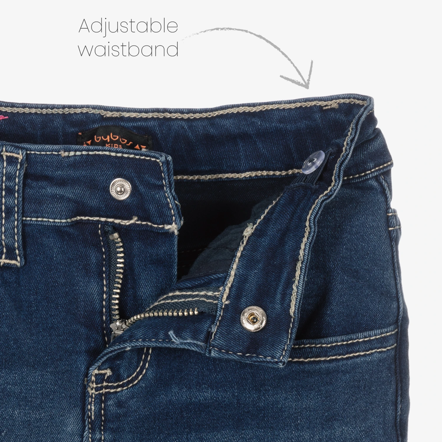 Mid-blue jeans for girls by Italian brand Byblos, with a bright pink logo flag on the back. They are made in soft and comfortable stretch denim and have faded detailing. There is an adjustable waistband for a good fit, four pockets, and popper and zip fastening.