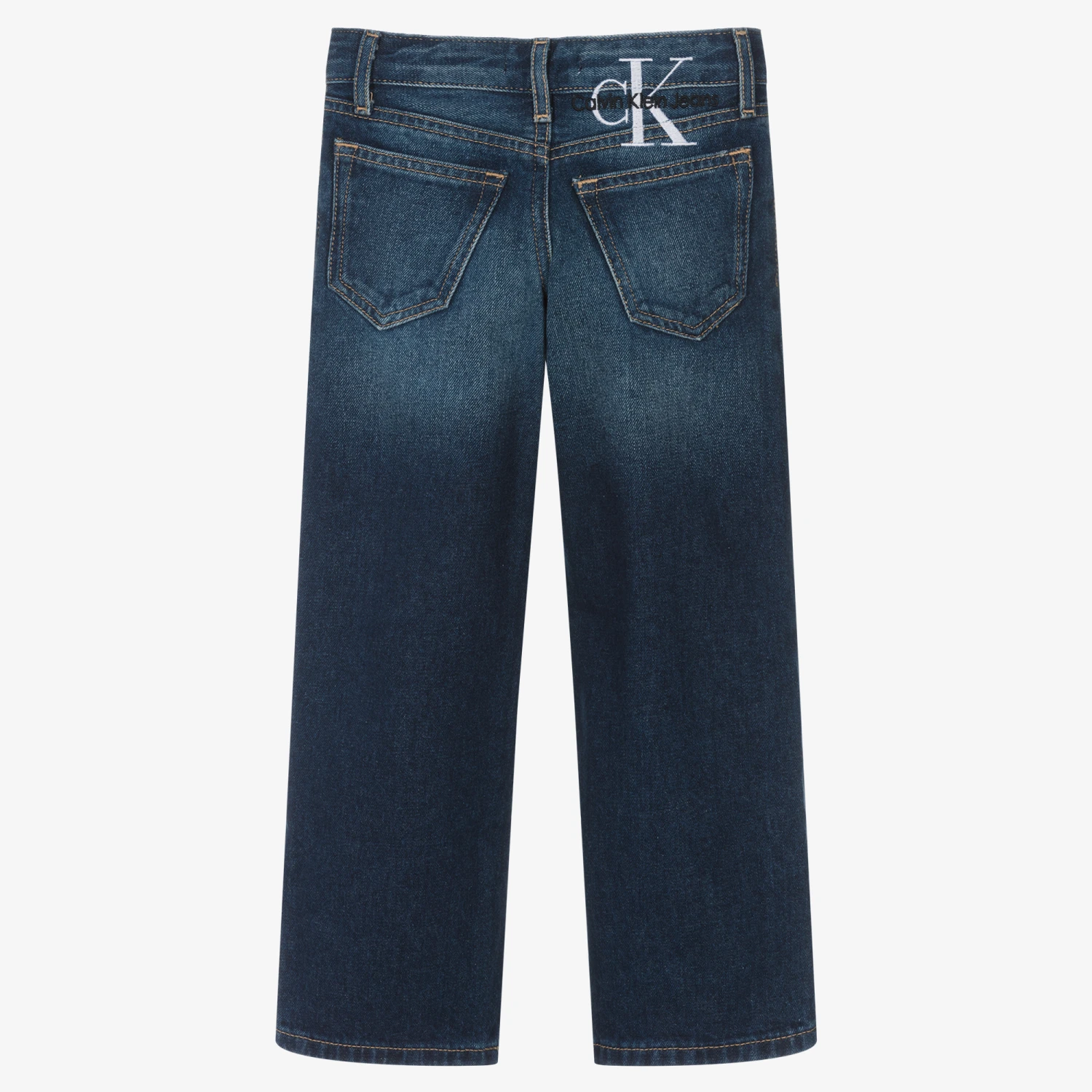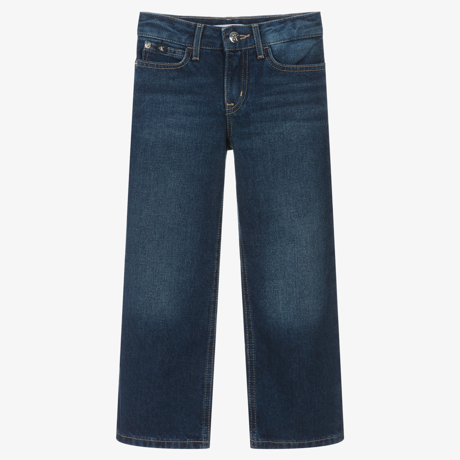 Girls cool dark blue wash jeans by Calvin Klein Jeans, made in mid-weight denim. In a trendy wide leg fit, they have logo embroidery on the back and a subtle black tab on the front. They have a classic five pocket design and have an adjustable waist for a good fit. They fasten easily with a logo button and zip.