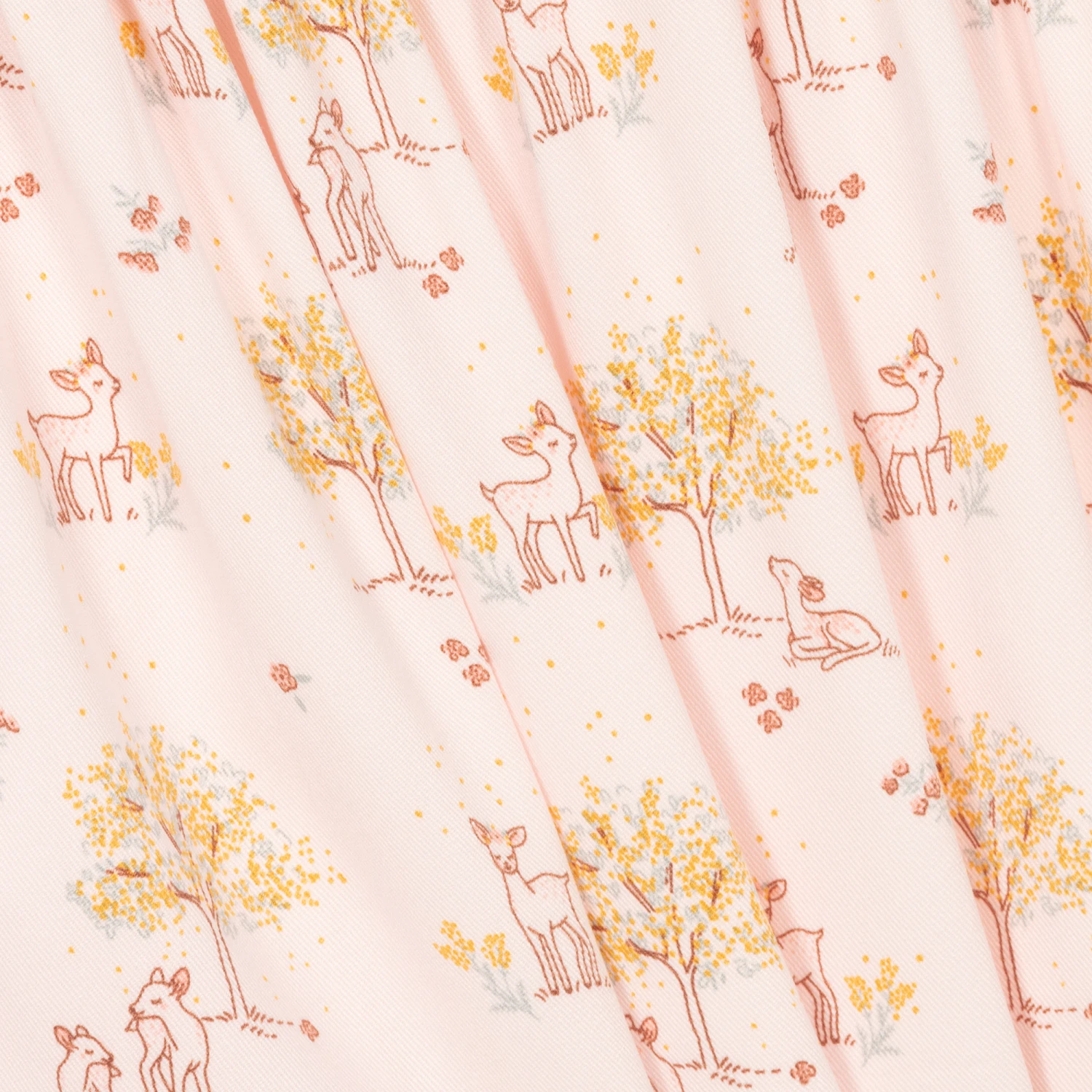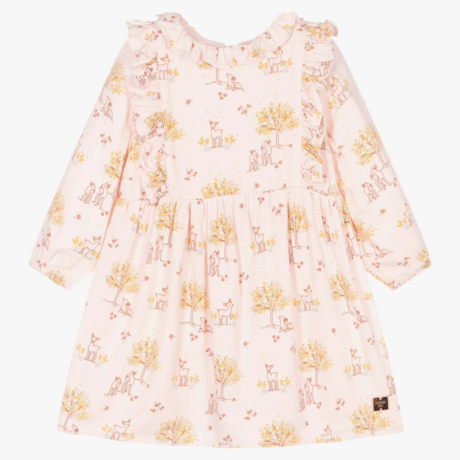 Pretty pink dress for little girls by Carrément Beau, with an adorable deer pattern in burgundy, yellow and grey. Made in soft viscose twill, this smart dress has beautiful ruffle trims, gently elasticated cuffs and a rose gold metal logo plate on the front hem. It is comfortably lined in lightweight viscose and fastens with a concealed zip on the back.
