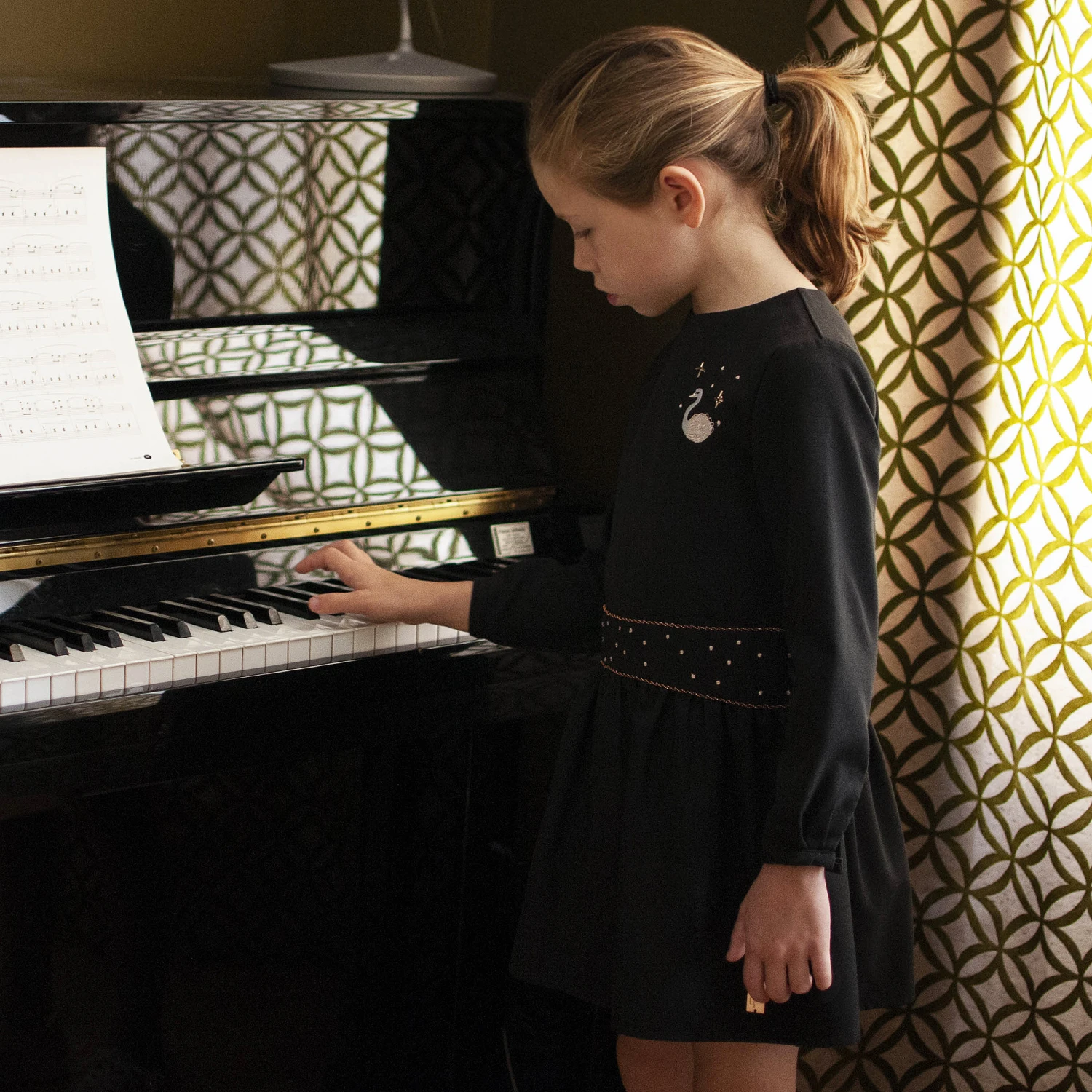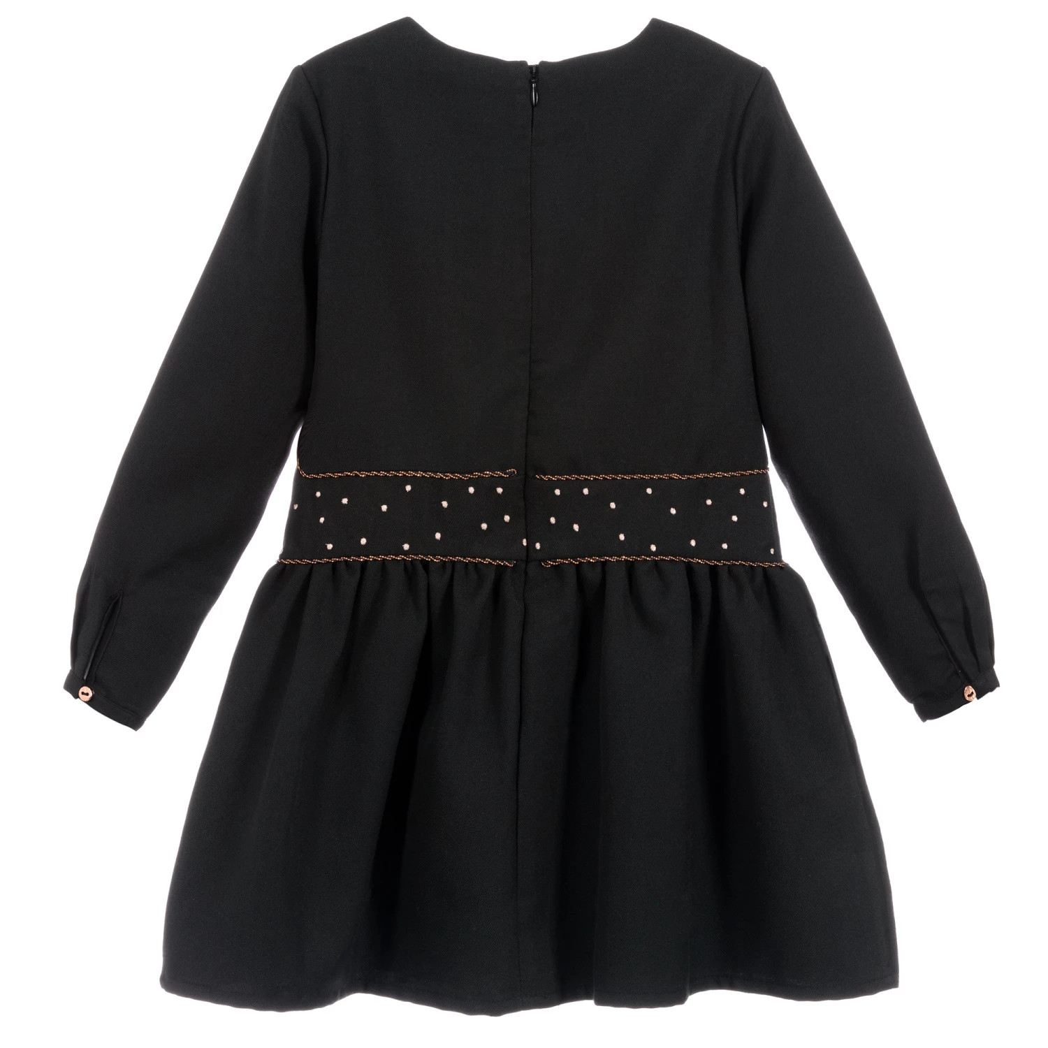 Girls very dark grey dress from Carrément Beau, made in a lightweight viscose twill. It has pink, white and gold swan embroidery, with beaded detail. There are embroidered pink dots on the waistband with rose gold beaded trim, and a soft cotton lining.