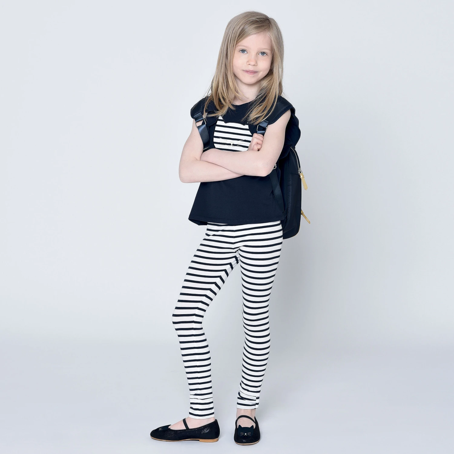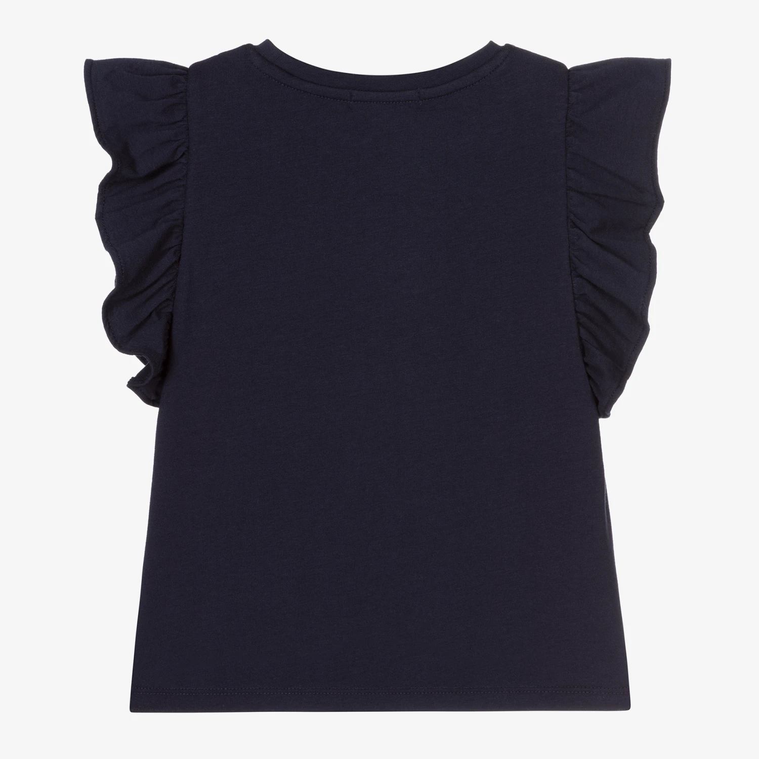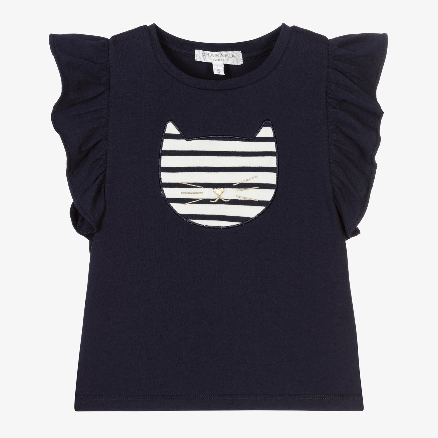 Navy blue T-shirt for girls by Charabia. It is made in soft cotton jersey and has pretty ruffle sleeves. There is a cute cat motif on the front, in navy blue and white stripes, with gold embroidery detailing.