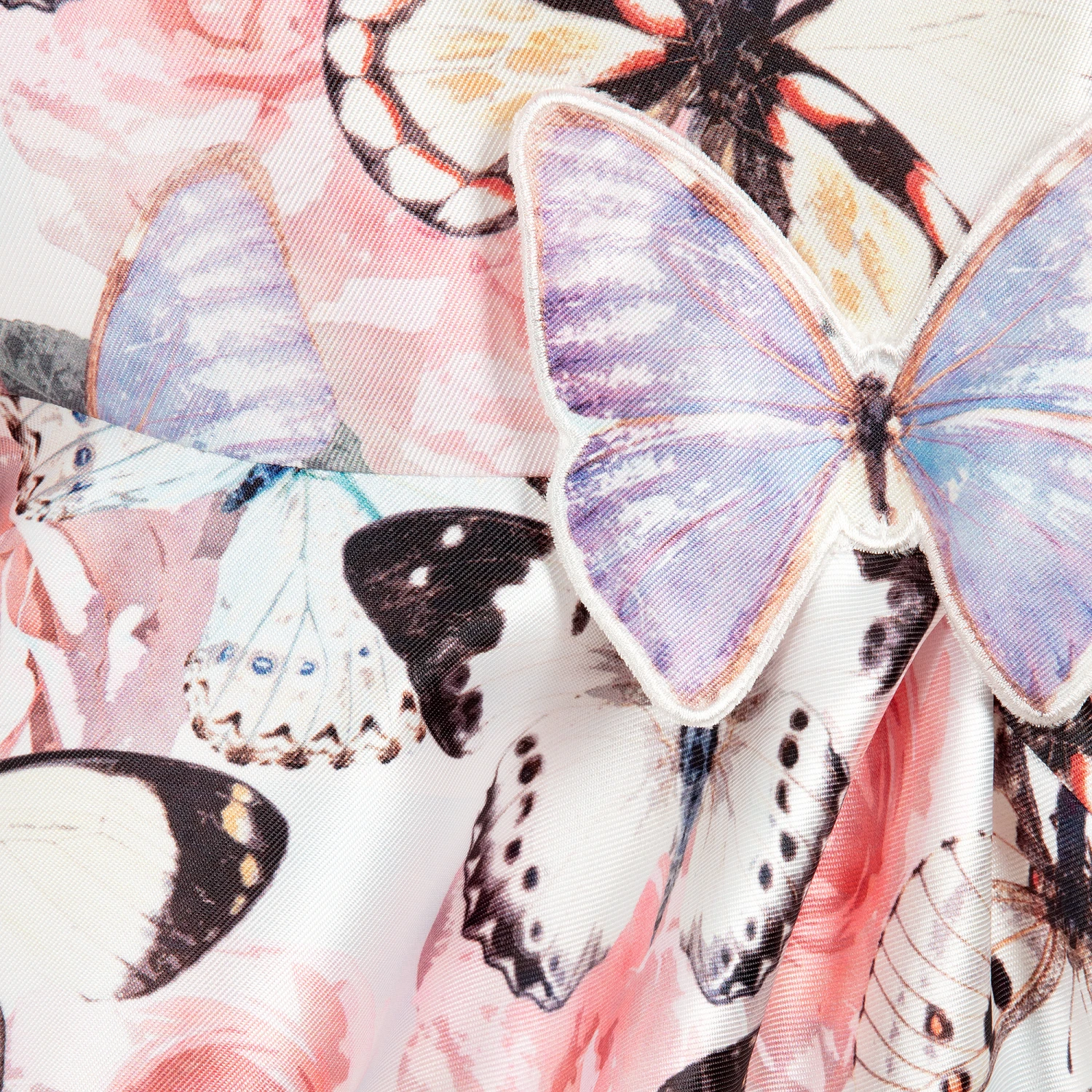 Ivory butterfly print dress for girls, made in silky polyester satin for special occasions, by Charabia. With striking, three dimensional silk butterflies sewn on to the shoulder and waist. It is fully lined with a flared skater style skirt.