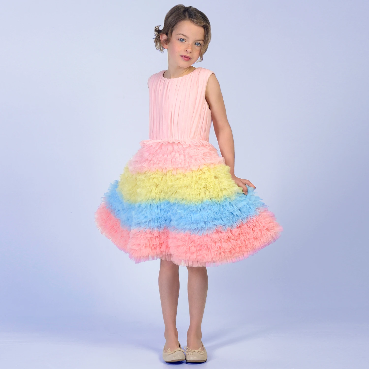 Wonderfully feminine, this eye-catching dress for girls is by Charabia. It has a gathered pink tulle bodice and layers of frilly tulle on the skirt, in pink, yellow and blue. It is lined in lightweight polycotton.