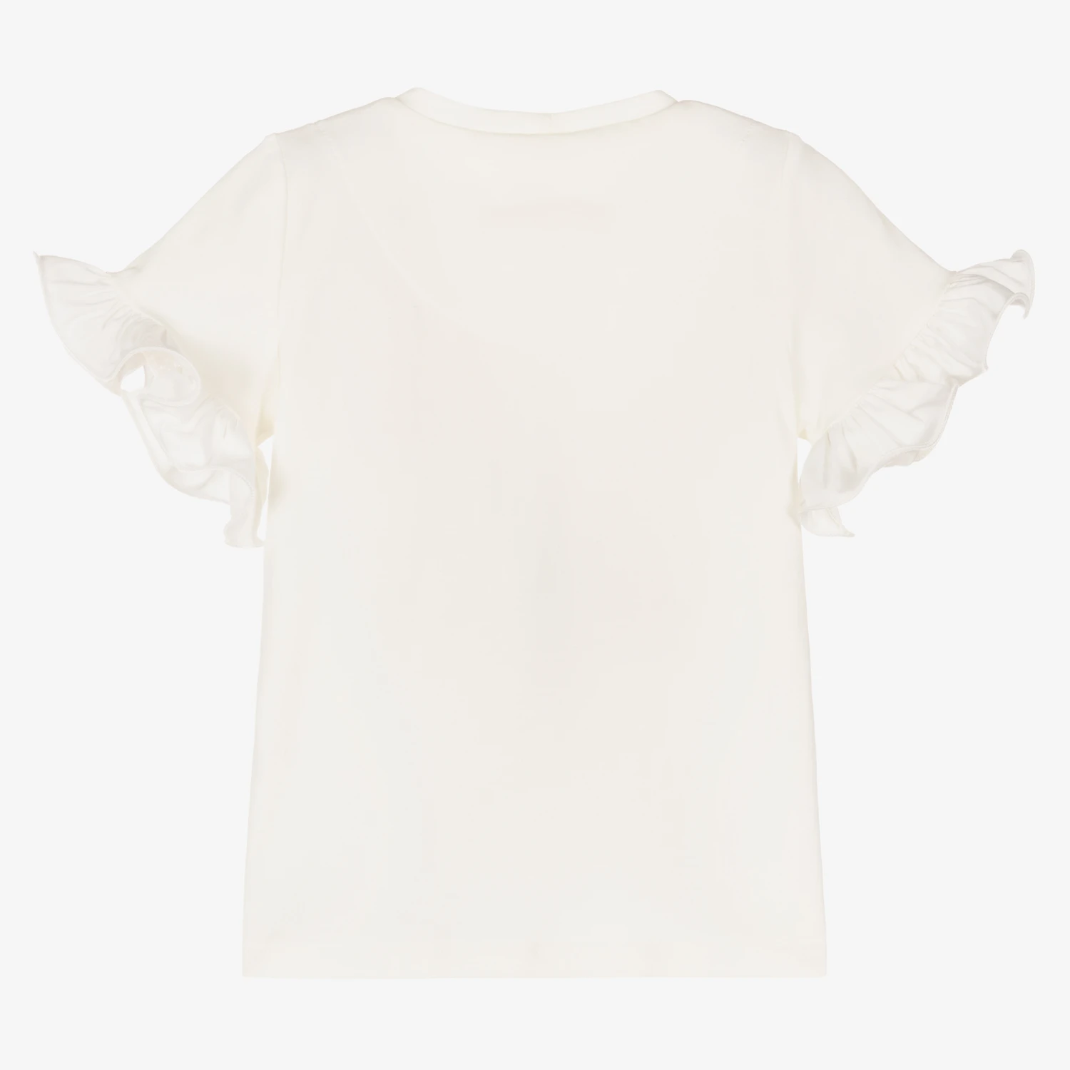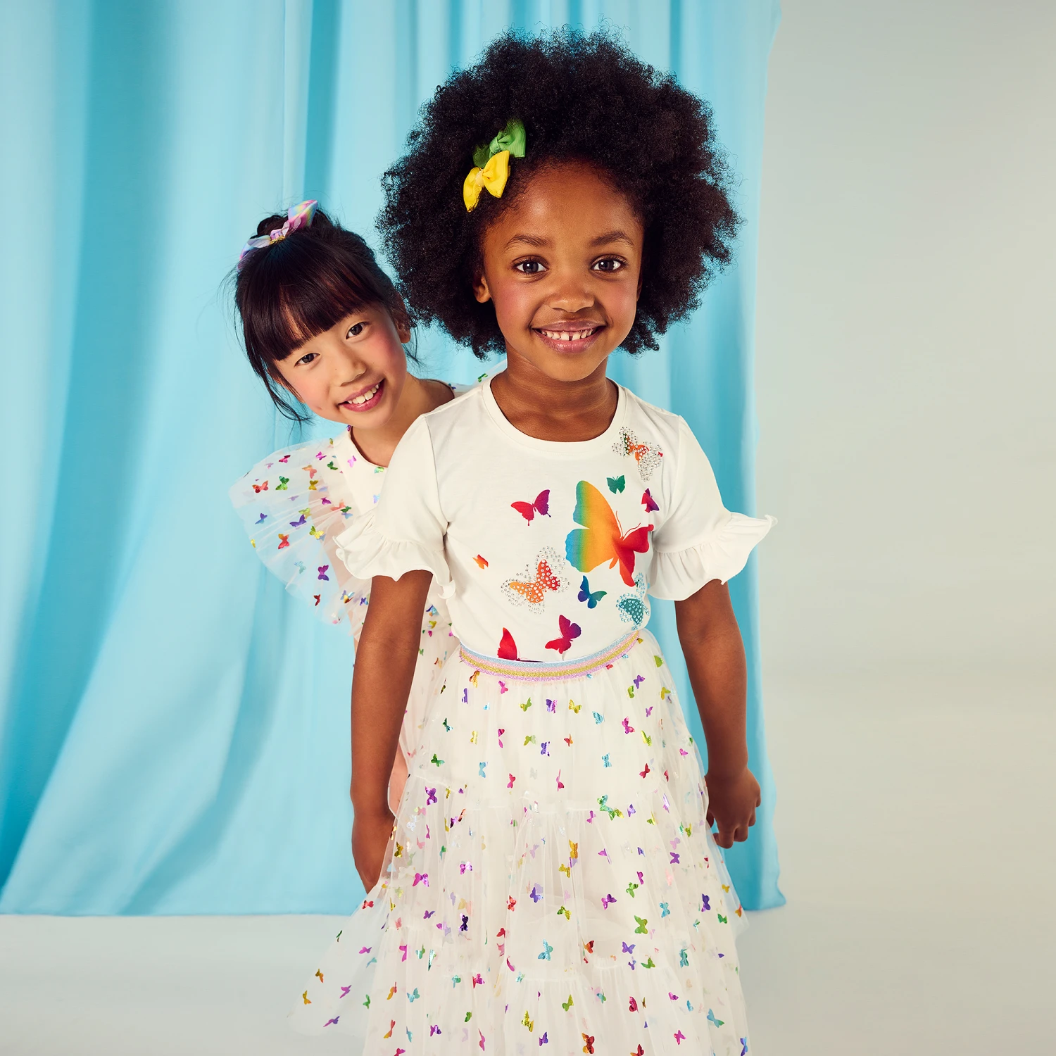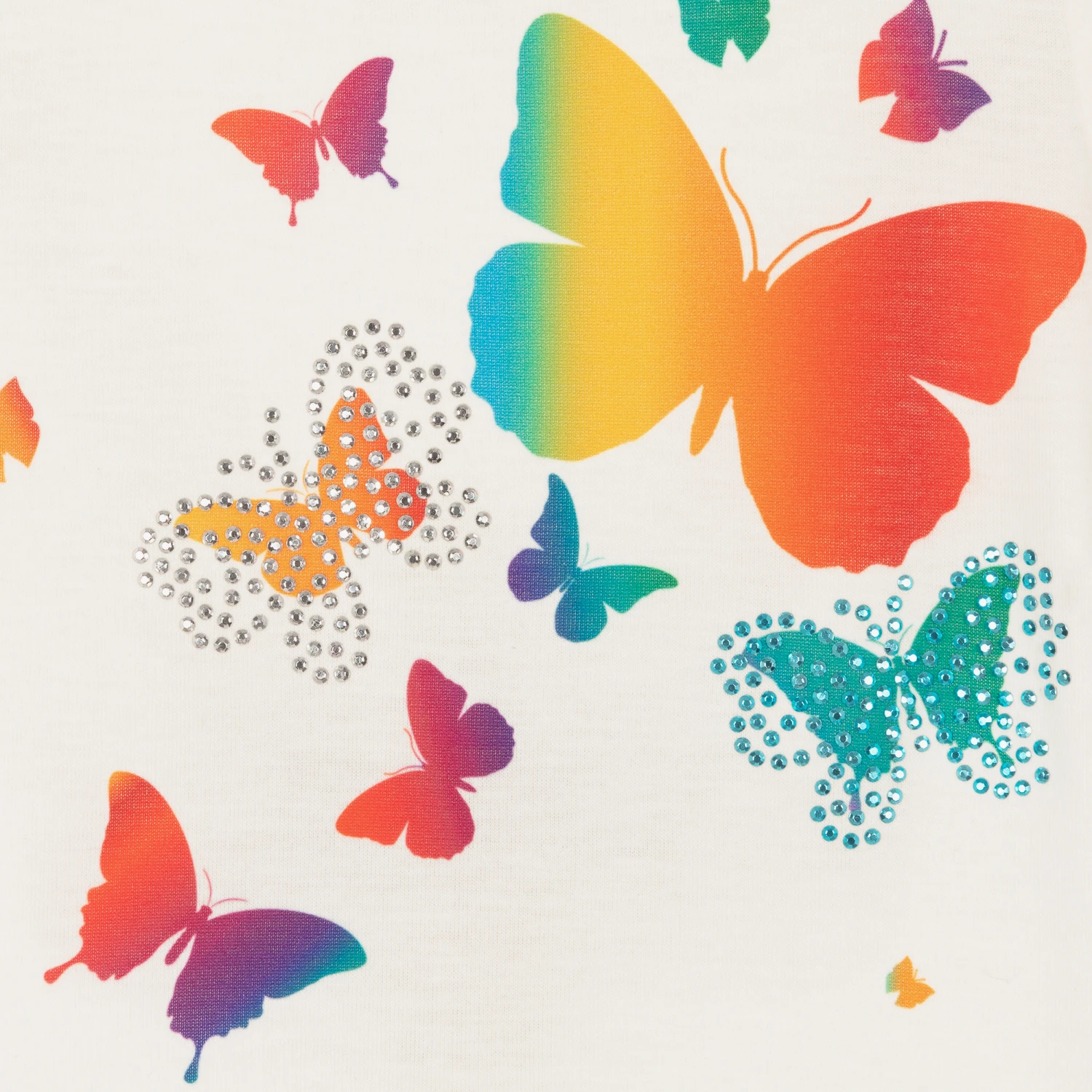 Eye-catching white cotton T-shirt for girls by Childrensalon Occasions, made in soft, comfortable jersey. It has a beautiful ombré butterfly print on the front in red, green, orange and blue, with sparkling studs that catch the light. As a finishing touch, the short sleeves are trimmed with pretty frills.