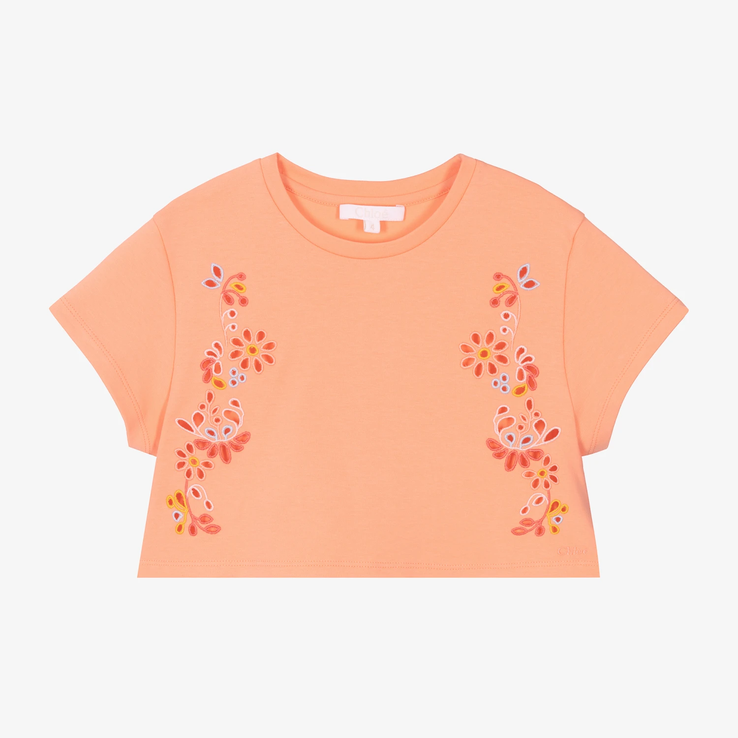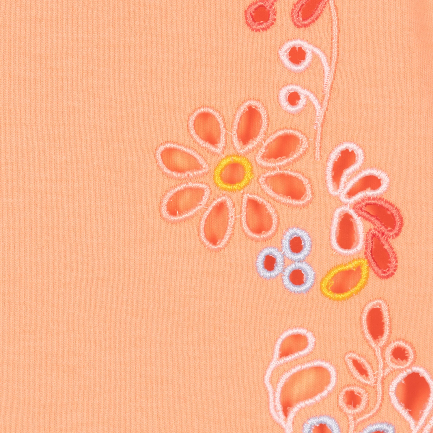 Mini-me coral orange T-shirt for girls by luxury French designer Chloé, made in stretchy, organic cotton jersey. As seen in the adult collection, this short-sleeved T-shirt has beautifully embroidered floral cut work on the front in shades of orange, pink, yellow and blue. The brand’s logo can be seen above the hem in tonal embroidery.