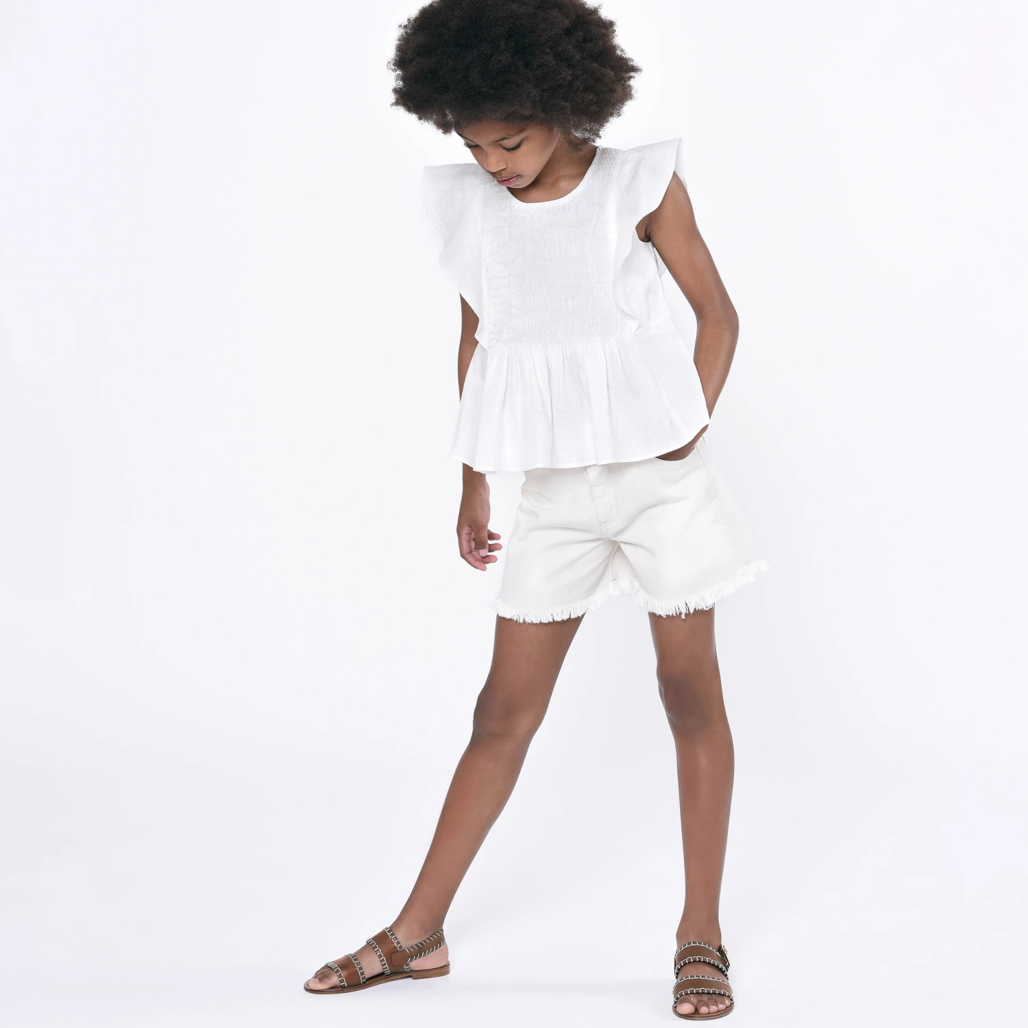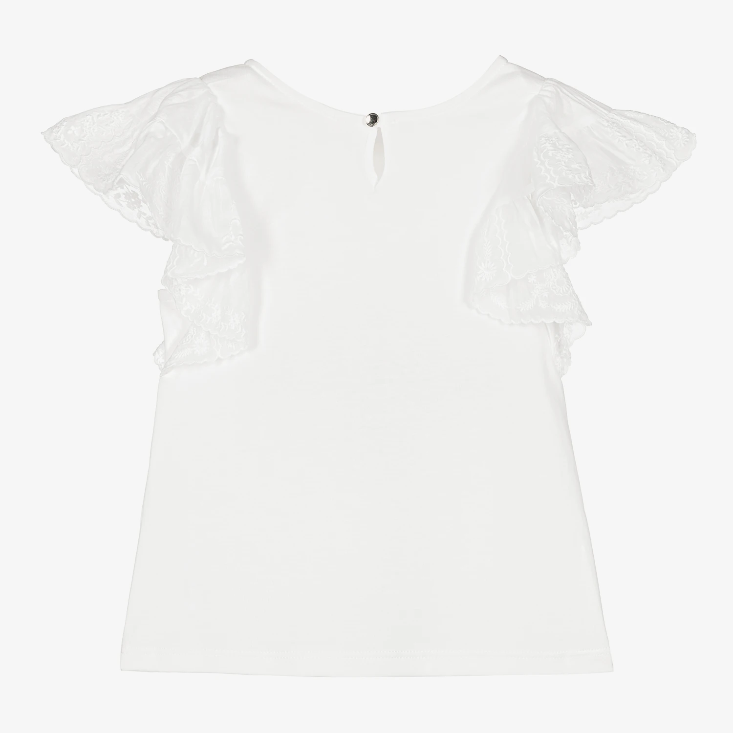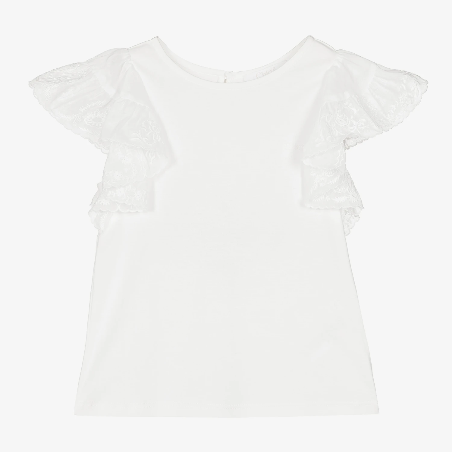 Casual and chic, an ivory T-shirt for girls by French label Chloé. Beautifully sheer and ruffled, the voile sleeves are embroidered with delicate florals, the signature ‘C’ logo and scalloped borders in the motifs. It is made in soft and comfortable organic cotton jersey with a gold tone button to fasten on the back and a little tonal logo embroidered on the chest.