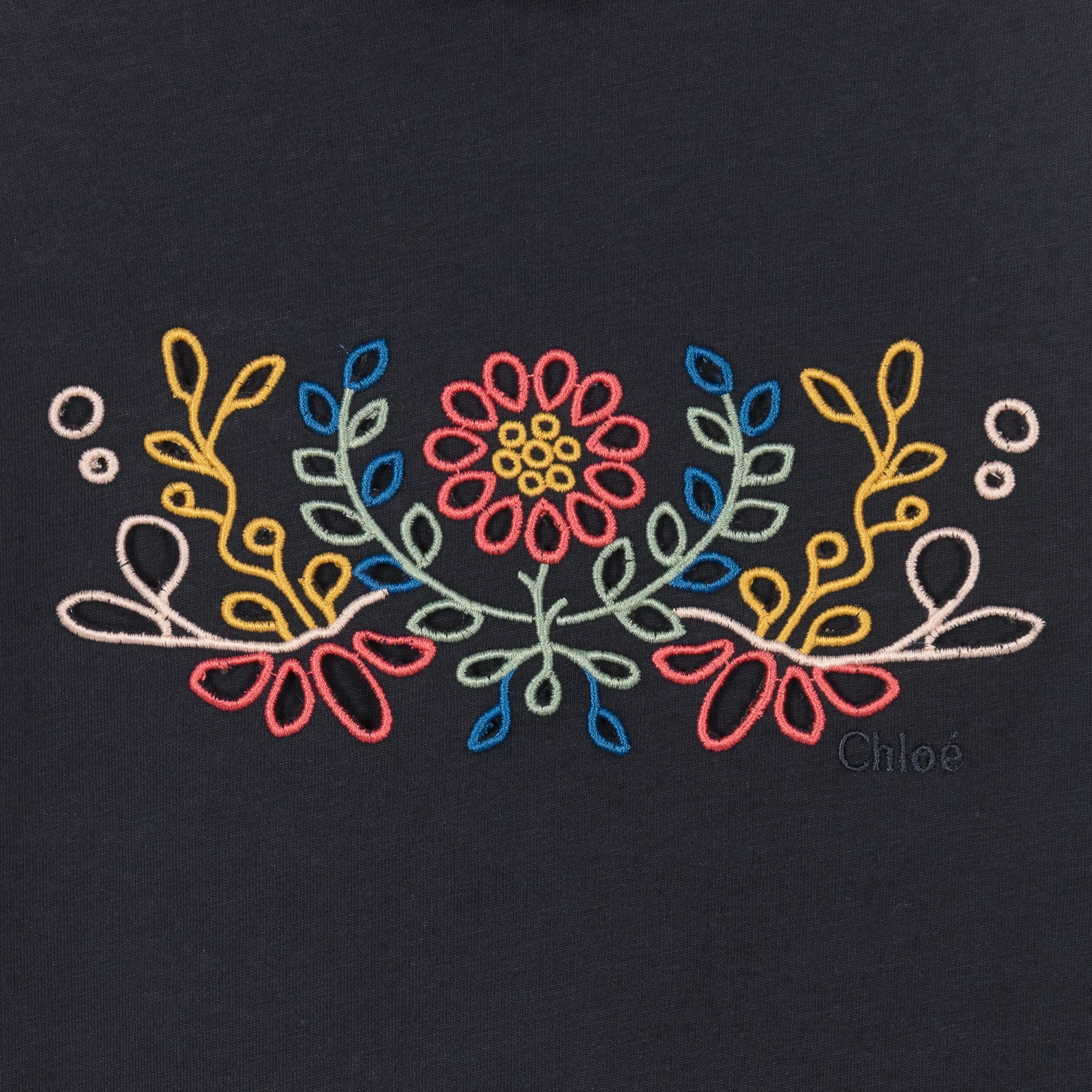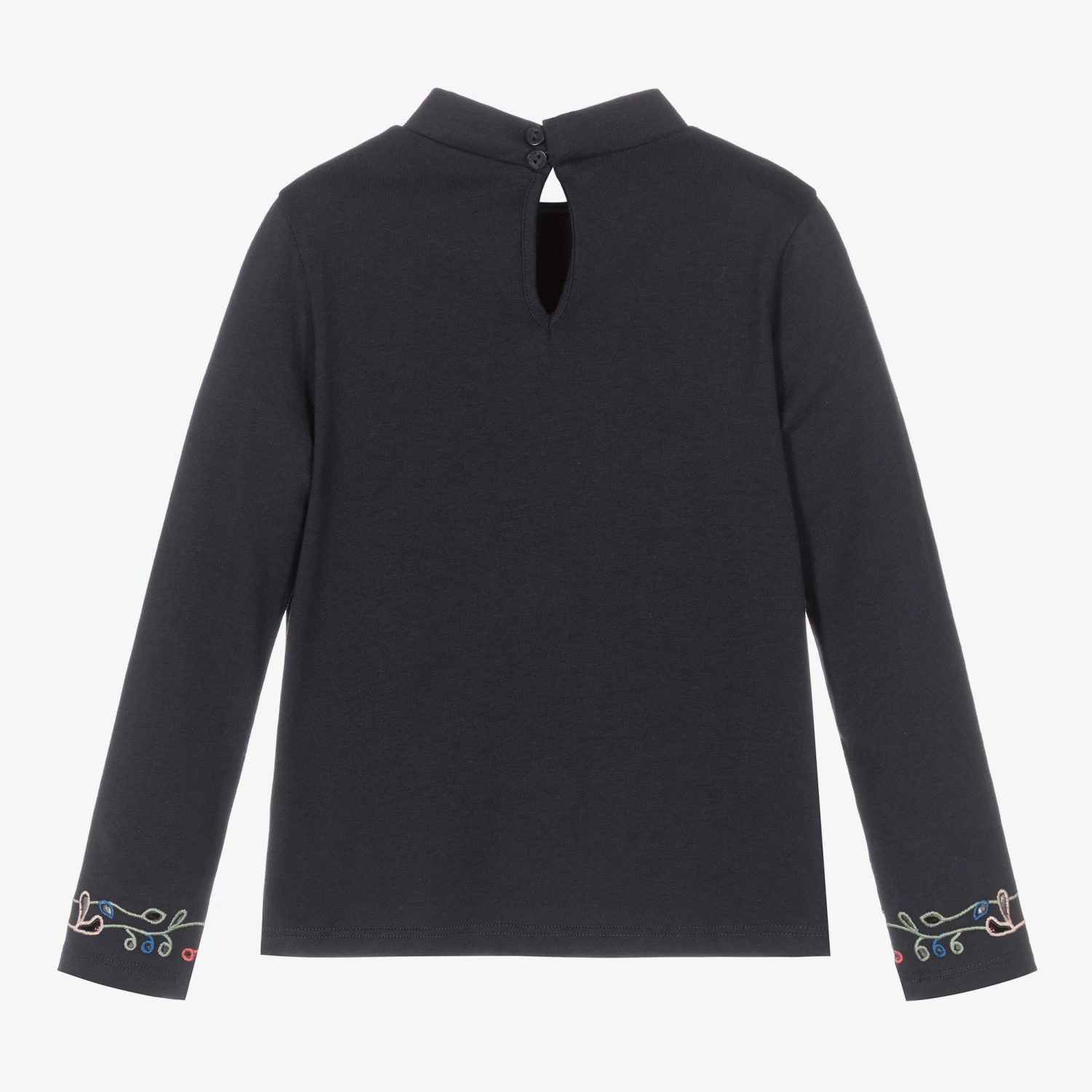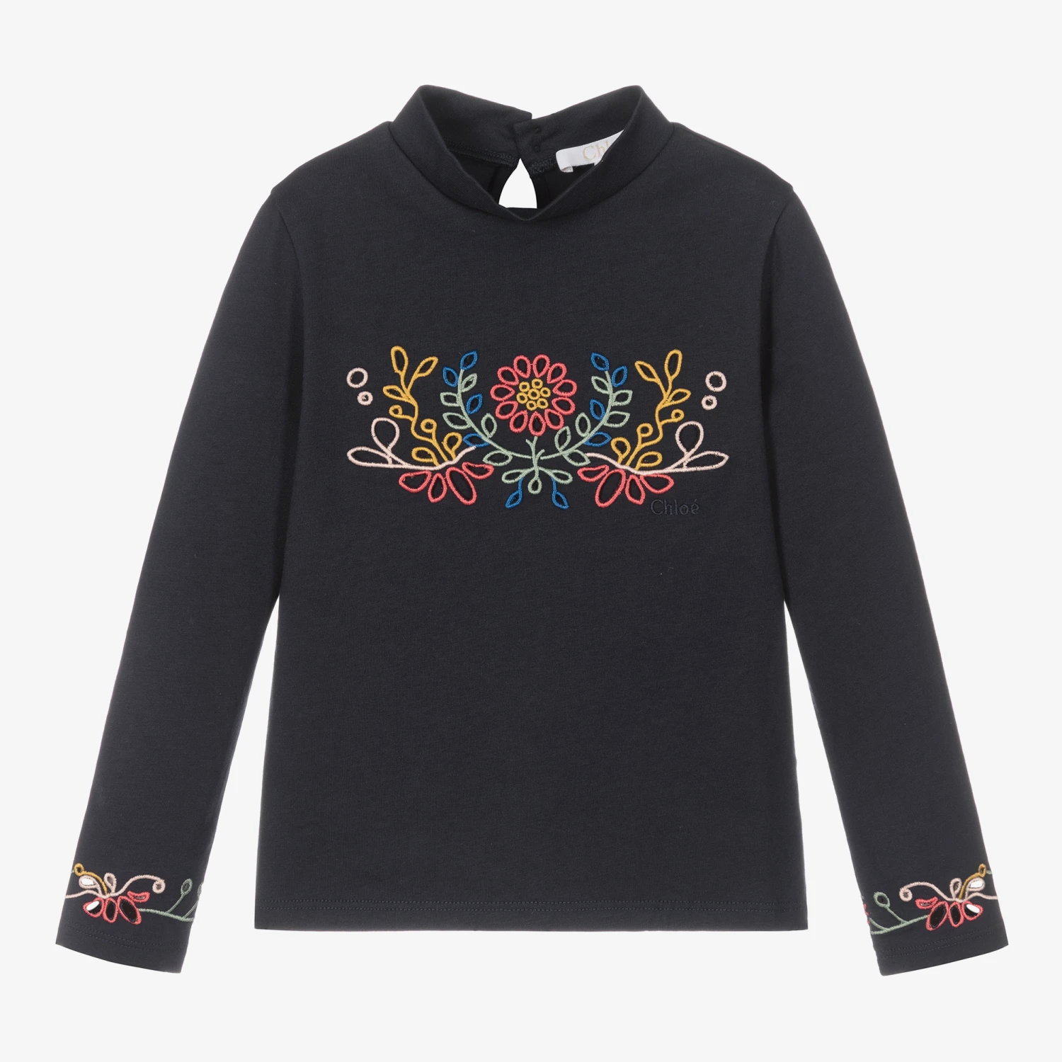 Navy blue top for teen girls by luxury French designer Chloé. The front is beautifully detailed with colourful cut-out floral embroidery and a discreet logo. It has a chic turtleneck and there are matching embroidered motifs around the sleeve cuffs. It fastens with two branded buttons on the back for easy dressing and is made in soft organic cotton jersey.