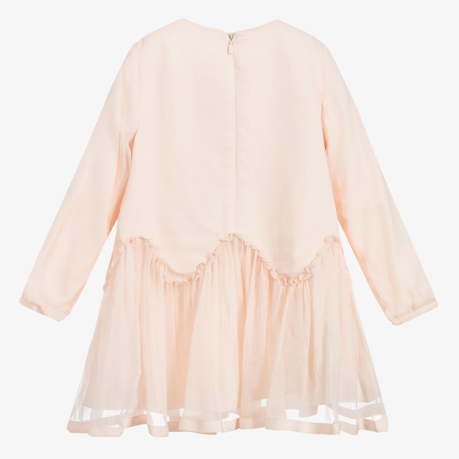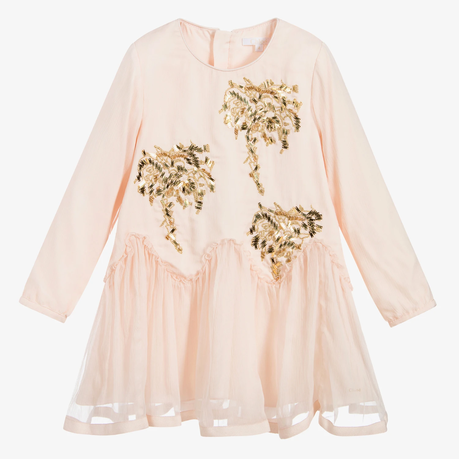 This luxurious pink dress by Chloé, the French fashion house known for its feminine, modern classics, is exclusive to Childrensalon. Perfect for special days and with a super comfortable loose fit, it is made in soft, fine, silk crêpe decorated with tiny twinkling plates, golden beads and embroidery. The designer’s logo is printed in shiny gold by the hemline of the beautifully soft cotton lining.