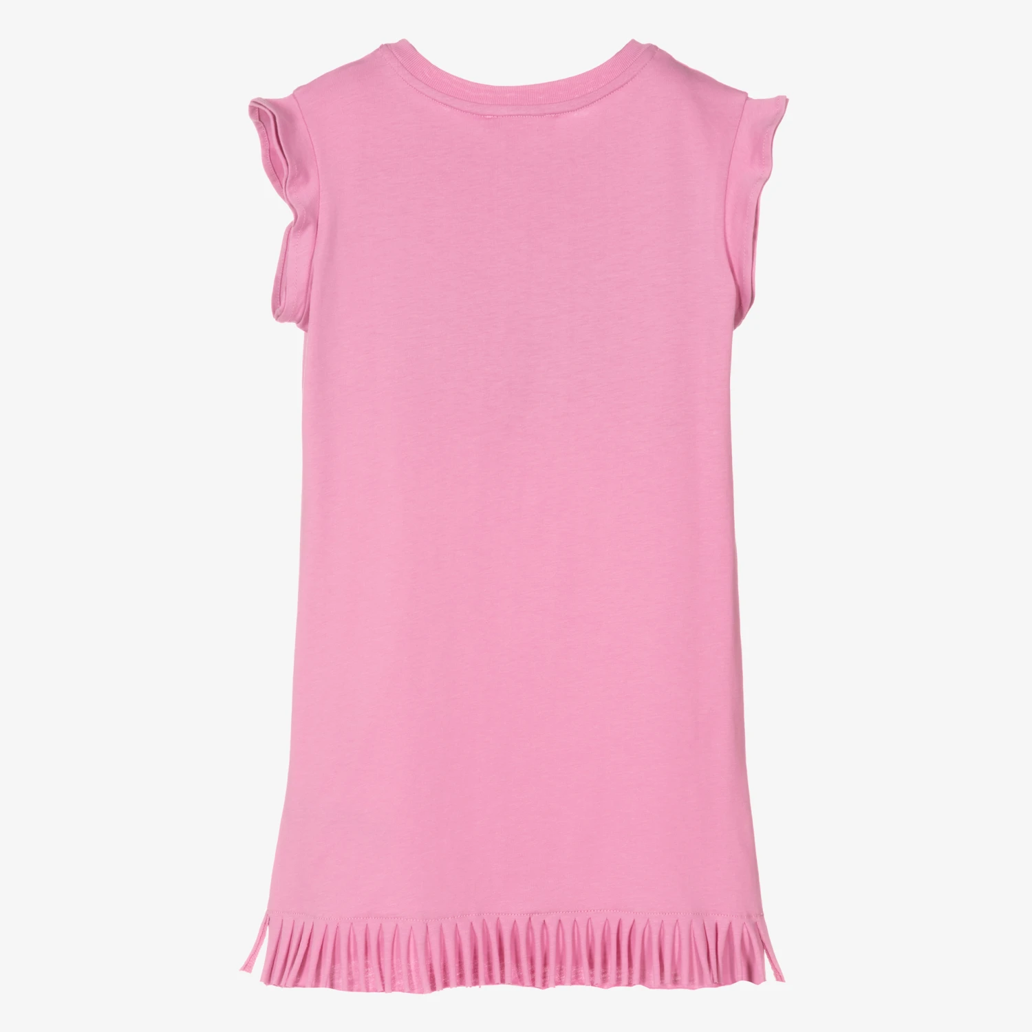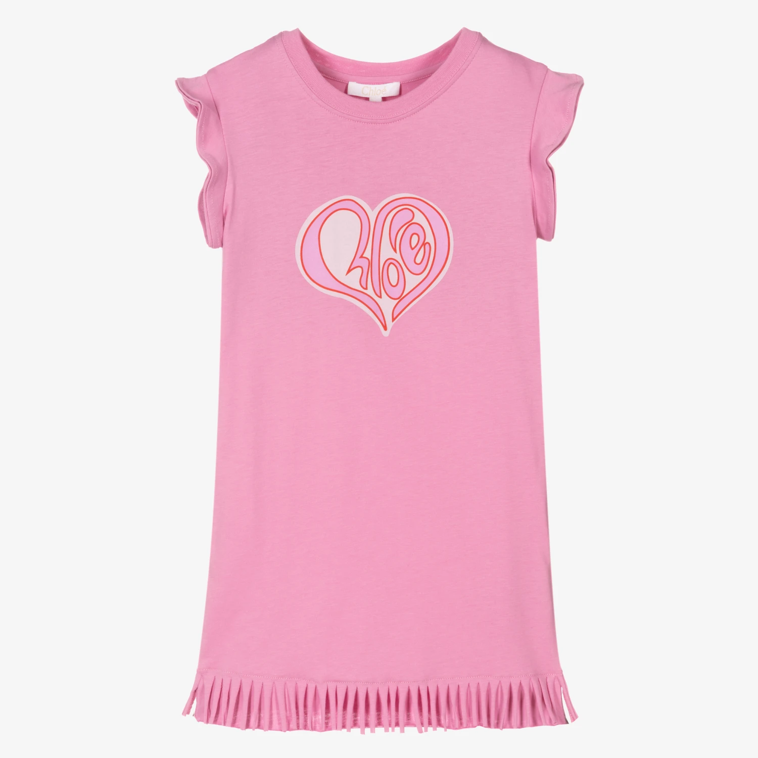 Girls pink T-shirt dress by luxury French brand Chloé, made in soft and stretchy organic cotton jersey. There is a white and pink Chloé Hearty logo print on the front, ruffle sleeves and a pretty fringed hemline.