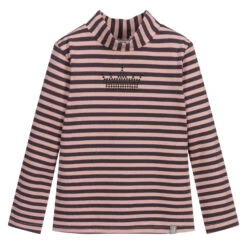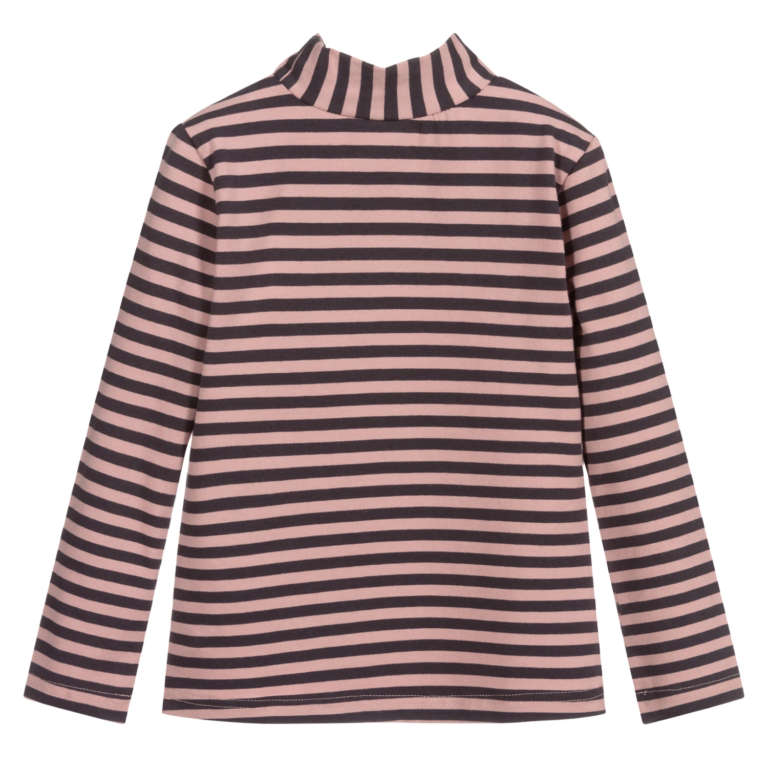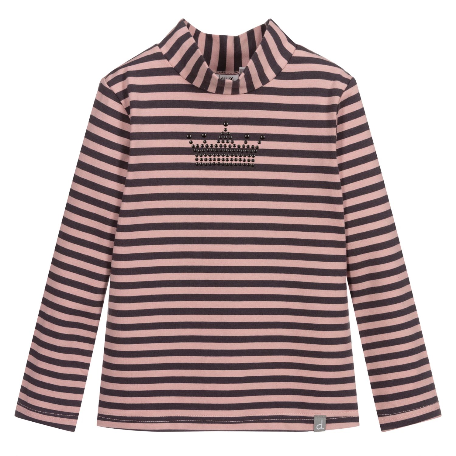 Pink and navy blue striped top for girls by Deux Par Deux, made in soft organic cotton jersey. It has a black studded crown motif on the front.
