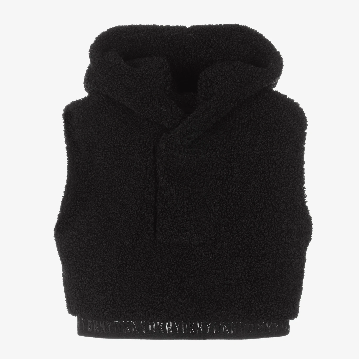 Cosy and comfy for girls, this black teddy fleece hooded top is by DKNY. This shorter length style has a logo patch on the back of the hood, with an elasticated logo tape hem. It fastens with poppers on the chest and is lined in soft cotton jersey.