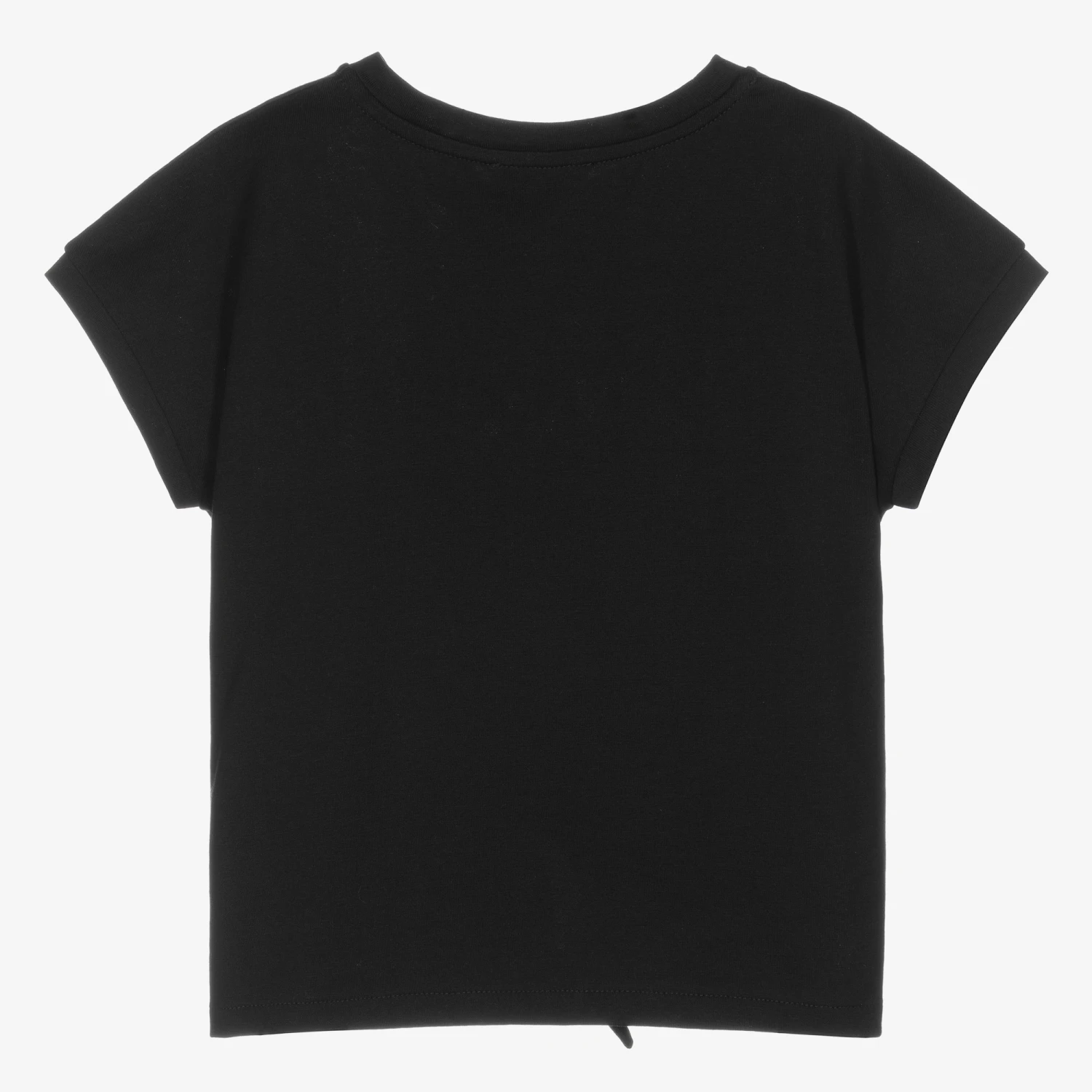 Black T-shirt for girls by luxury Italian brand Dolce & Gabbana, made in soft cotton jersey. It has a knot detail on the front and colourful bead decorations. There is a white ‘Bellisima’ slogan print and logo patch beneath.