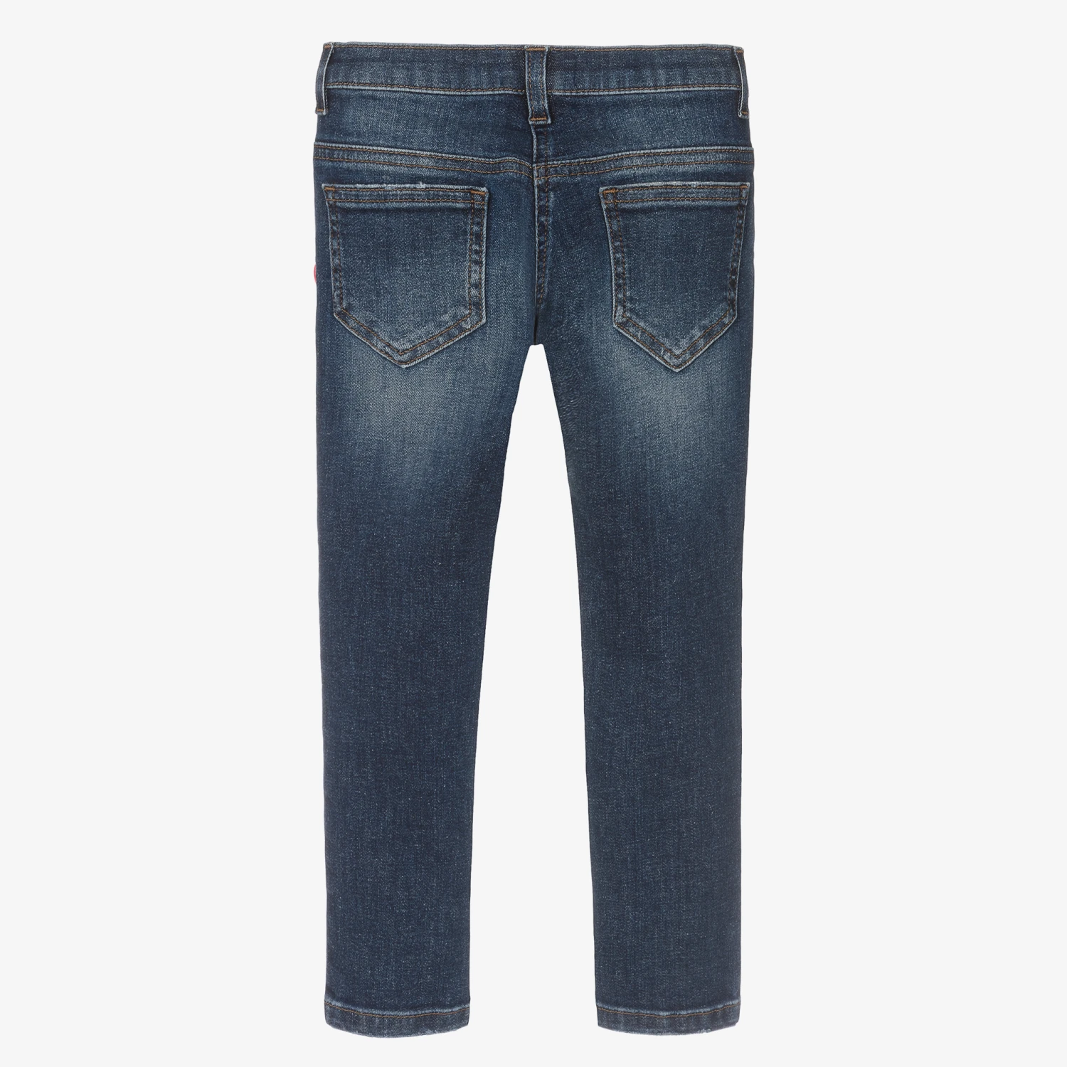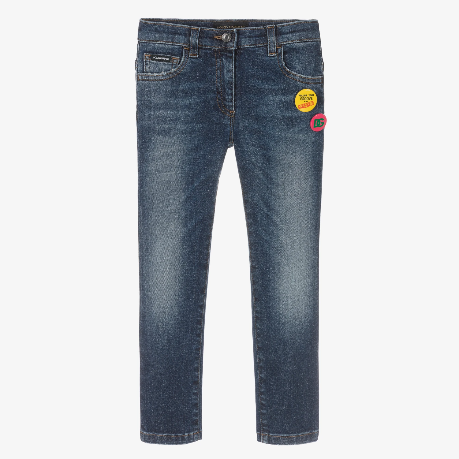Blue slim fit jeans for girls by luxury Italian designer Dolce & Gabbana, with eye-catching, colourful logo badges sewn on one side. In classic five pocket style, there is a logo tab on the coin pocket and a logo button and zip fastening on the front. They have a washed and worn look and are endlessly comfortable, being made in stretchy denim with an adjustable waist for a good fit.