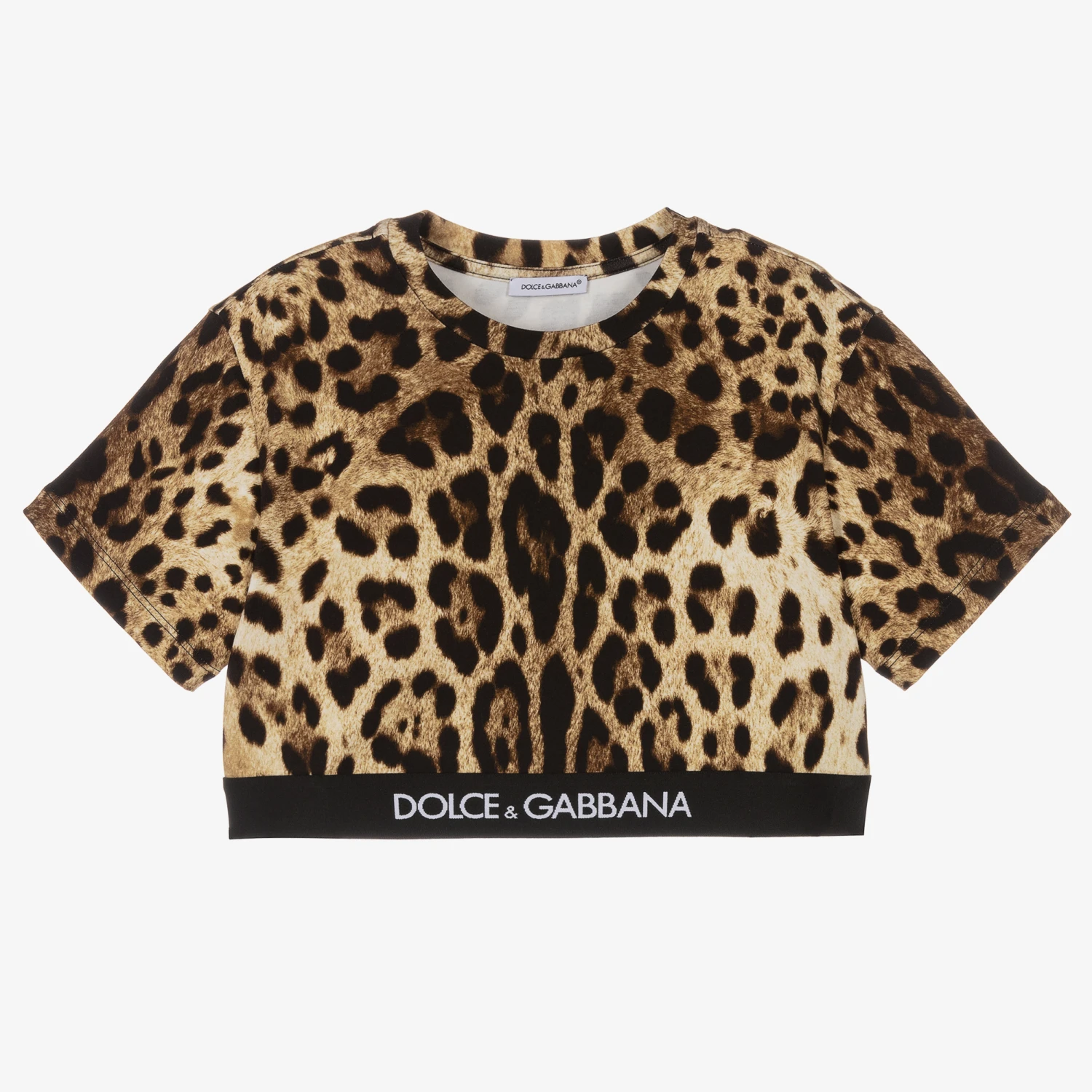 Inspired by the women’s collection, this cropped top for girls by Dolce & Gabbana, in the designer’s signature brown, black, and beige leopard print. It features a black elasticated trim with a white jacquard logo on the front, adding a sporty vibe and designer element to this casual piece. It is made in luxury soft cotton jersey for comfort.