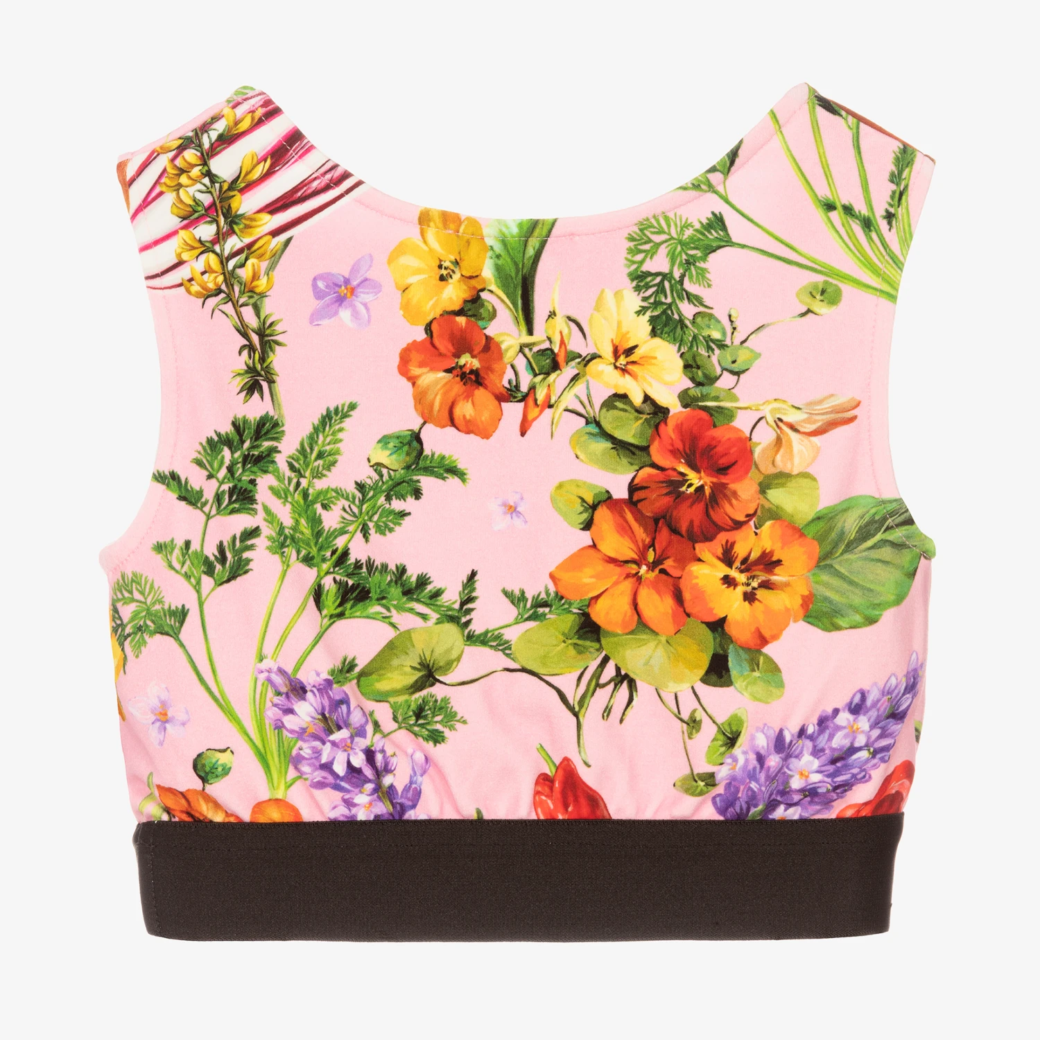 Pink cropped top for girls by luxury Italian designer Dolce & Gabbana, made in soft and stretchy cotton jersey. It has a vibrant floral and vegetable print in shades of yellow, red, orange, green and purple. This colourful piece has a black elasticated band with a white jacquard logo on the front for a cool designer finish.