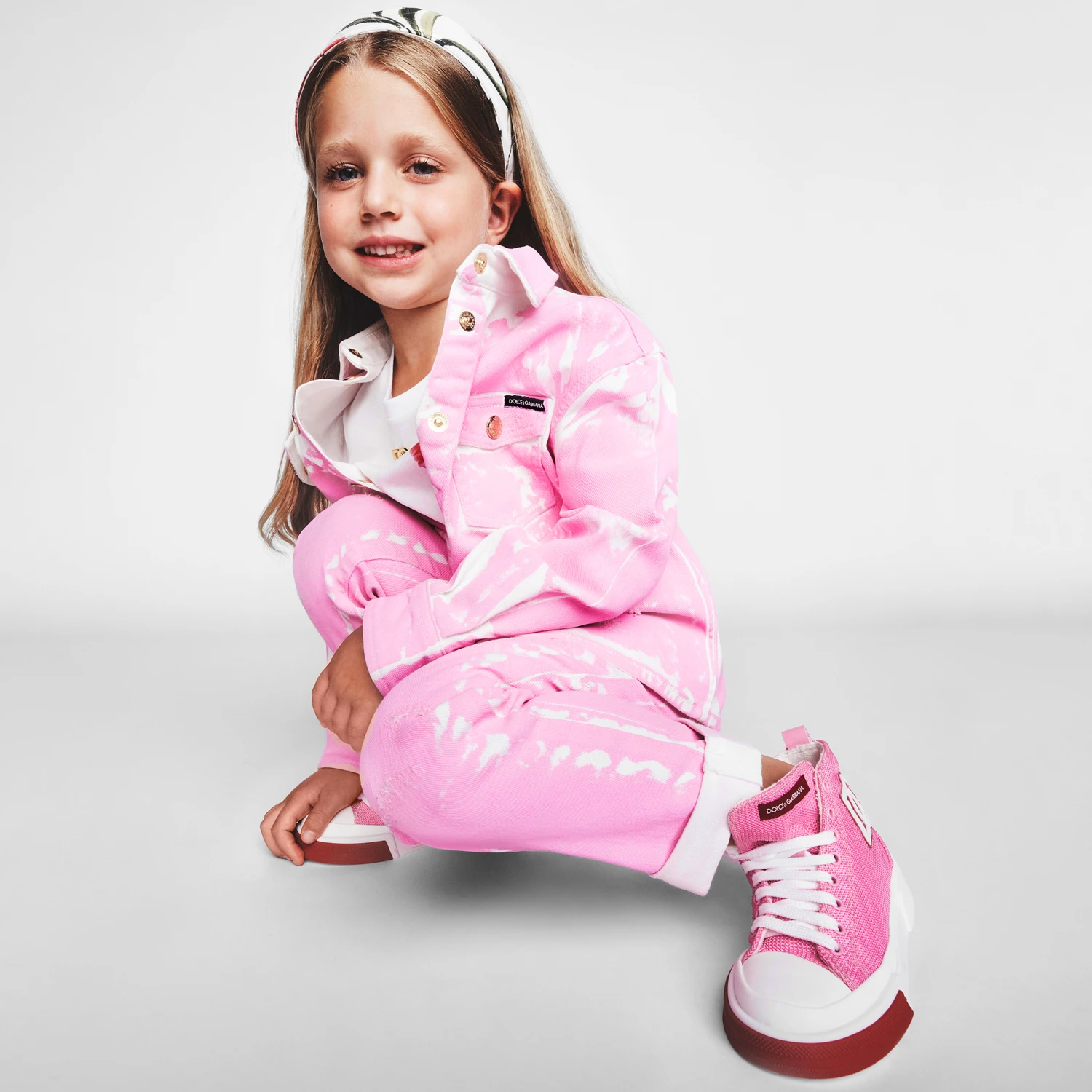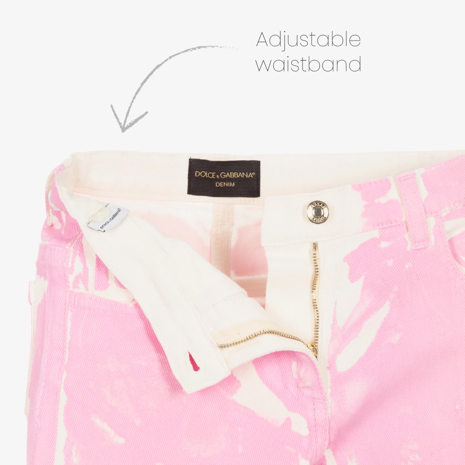 Unique pink denim jeans for girls by luxury Italian designer Dolce & Gabbana. Made to look painted, these cool distressed jeans have five-pocket detailing with a subtle logo patch on the coin pocket. They have fixed turn-up cuffs, a branded button and zip fastening, and an adjustable waistband. There is also a metal and leather logo plaque on the back pocket for a signature finish.