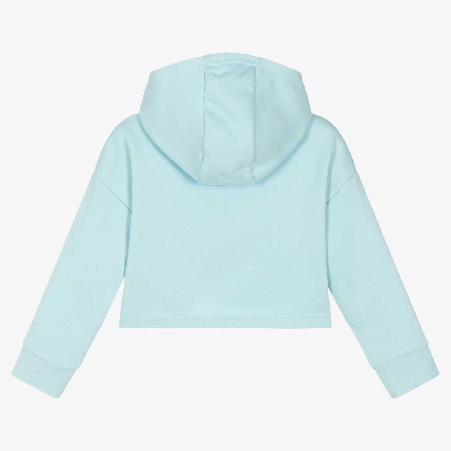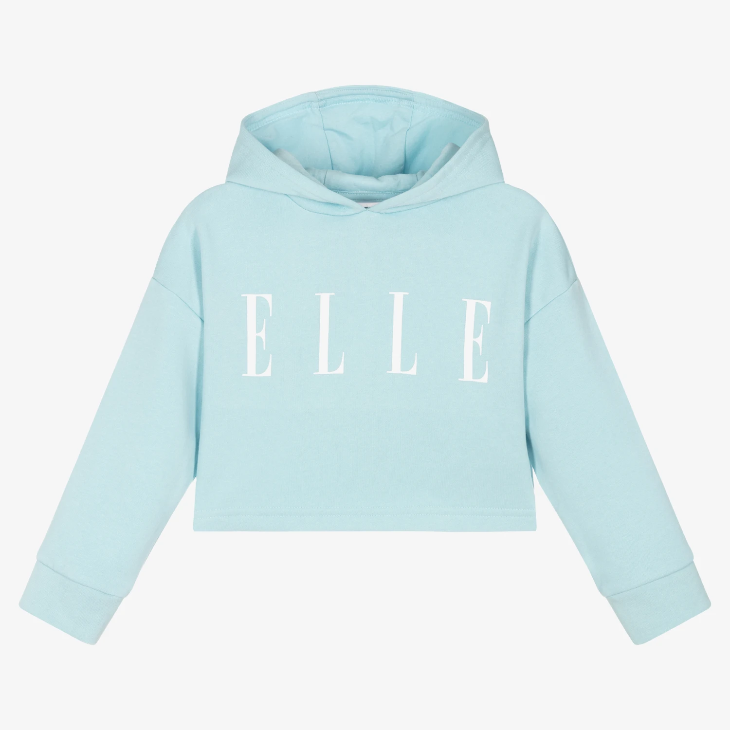 Cropped, pale blue hooded top for girls from Elle. Made in cotton-blend jersey with a soft brushed feel inside, it has a white logo print across the front.
