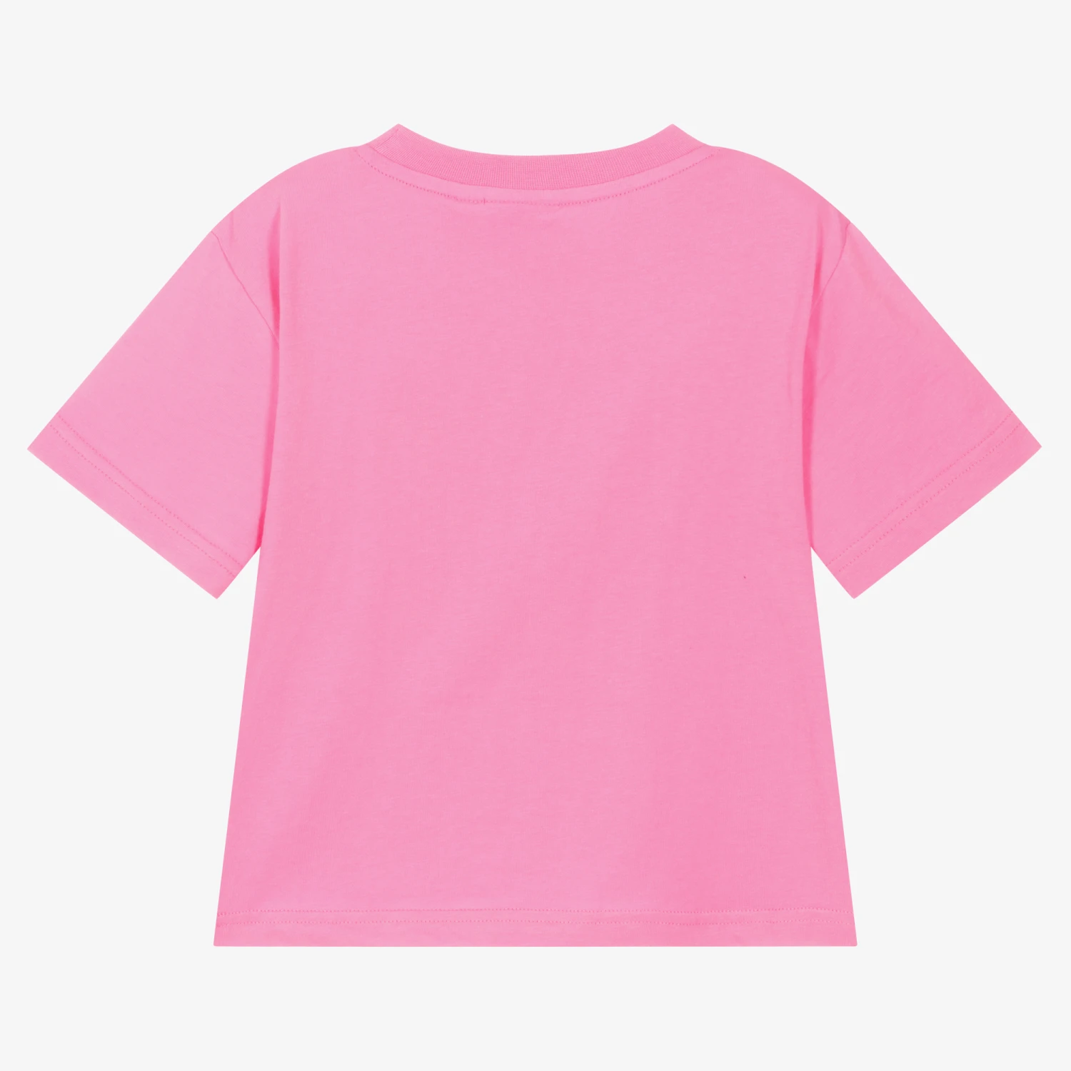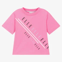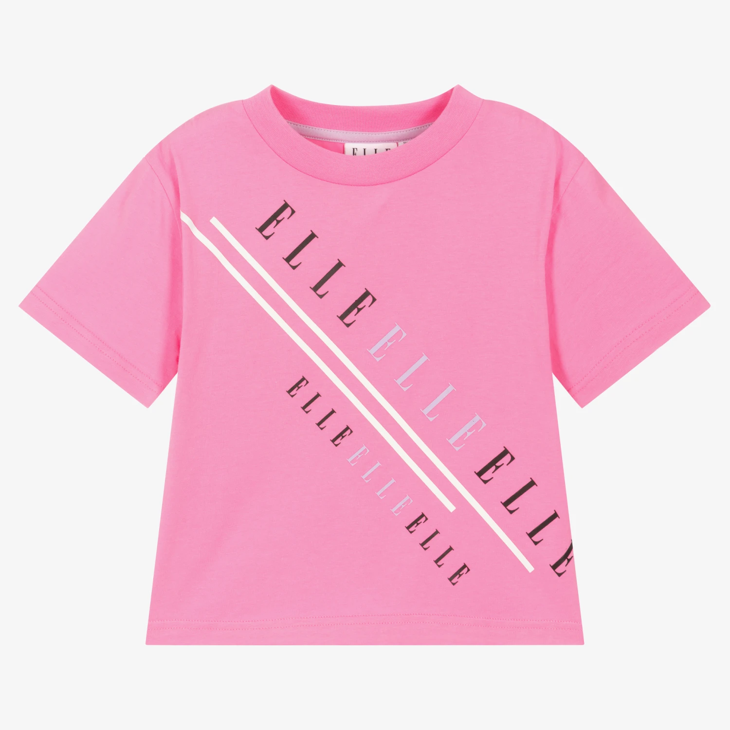 Cropped pink T-shirt for girls from Elle, with a diagonal rubberised logo print in black, lilac and white. It is made in soft and comfortable cotton jersey.