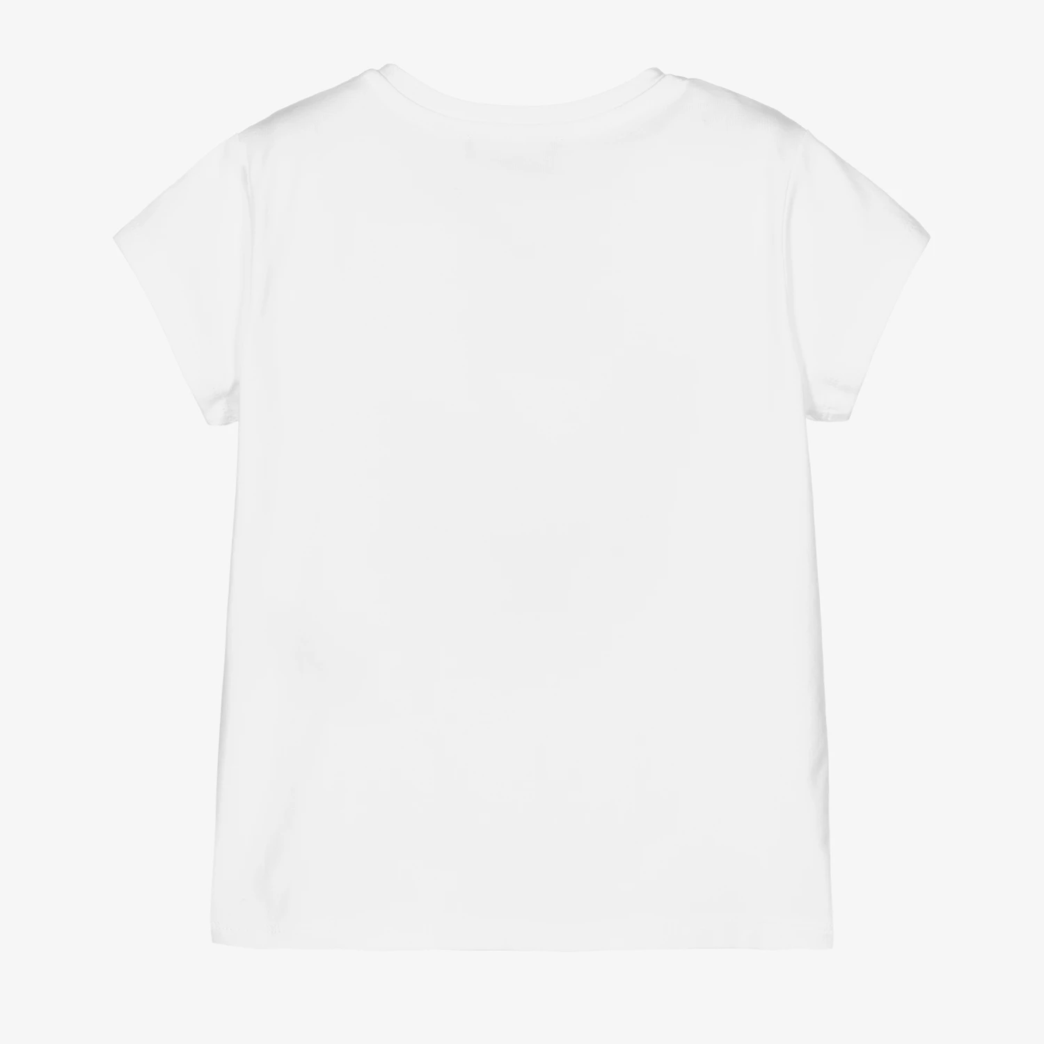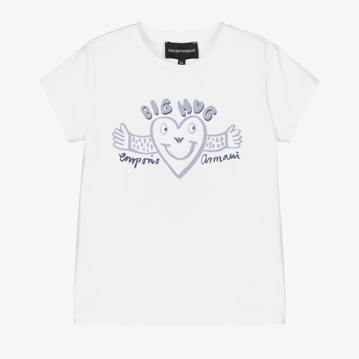 Girls white cotton T-shirt by Emporio Armani. Soft and stretchy, it has a sweet pale blue heart and ‘Big Hug’ print, with glitter accents and the designer’s Eagle logo motif. It fastens with branded poppers on the back for ease when dressing.