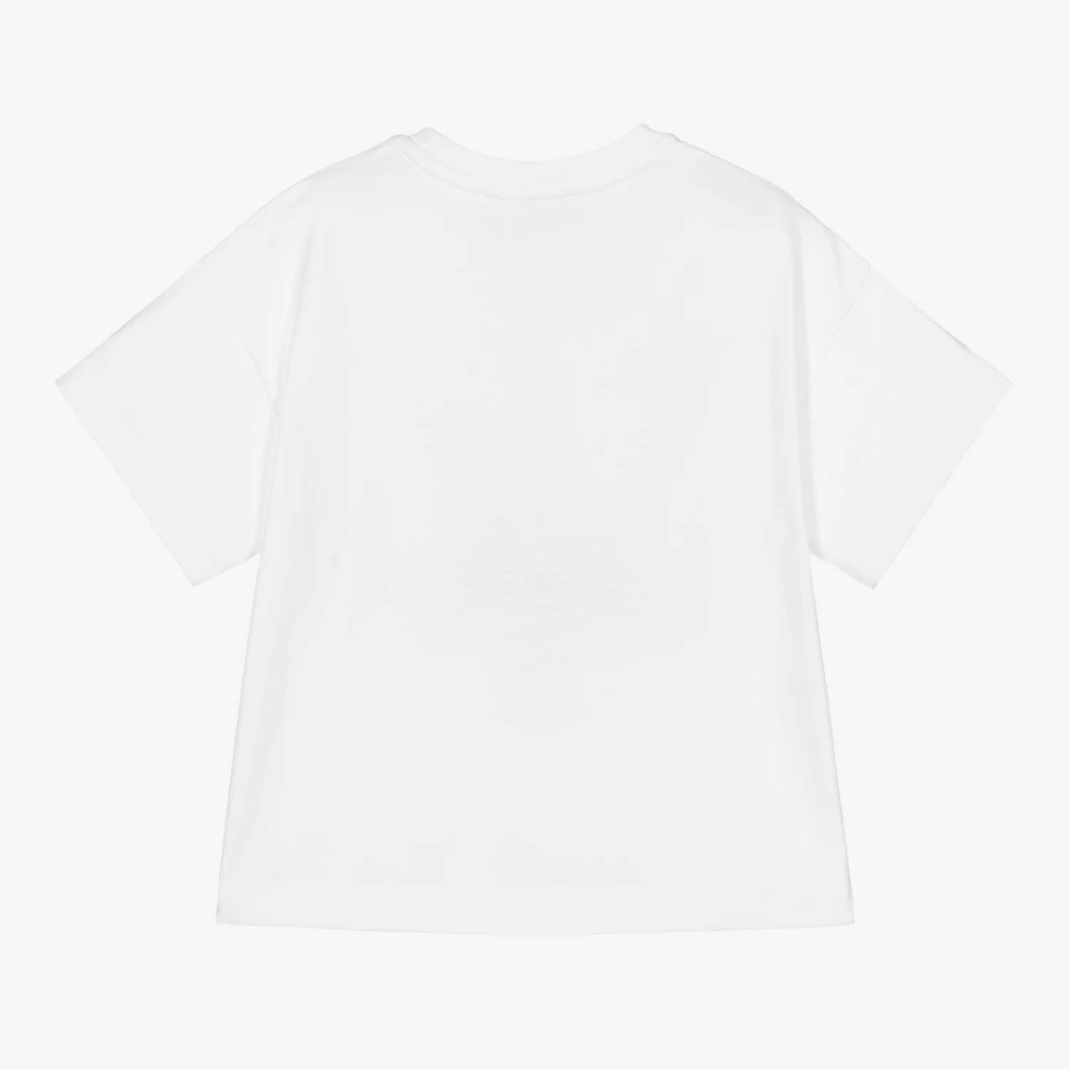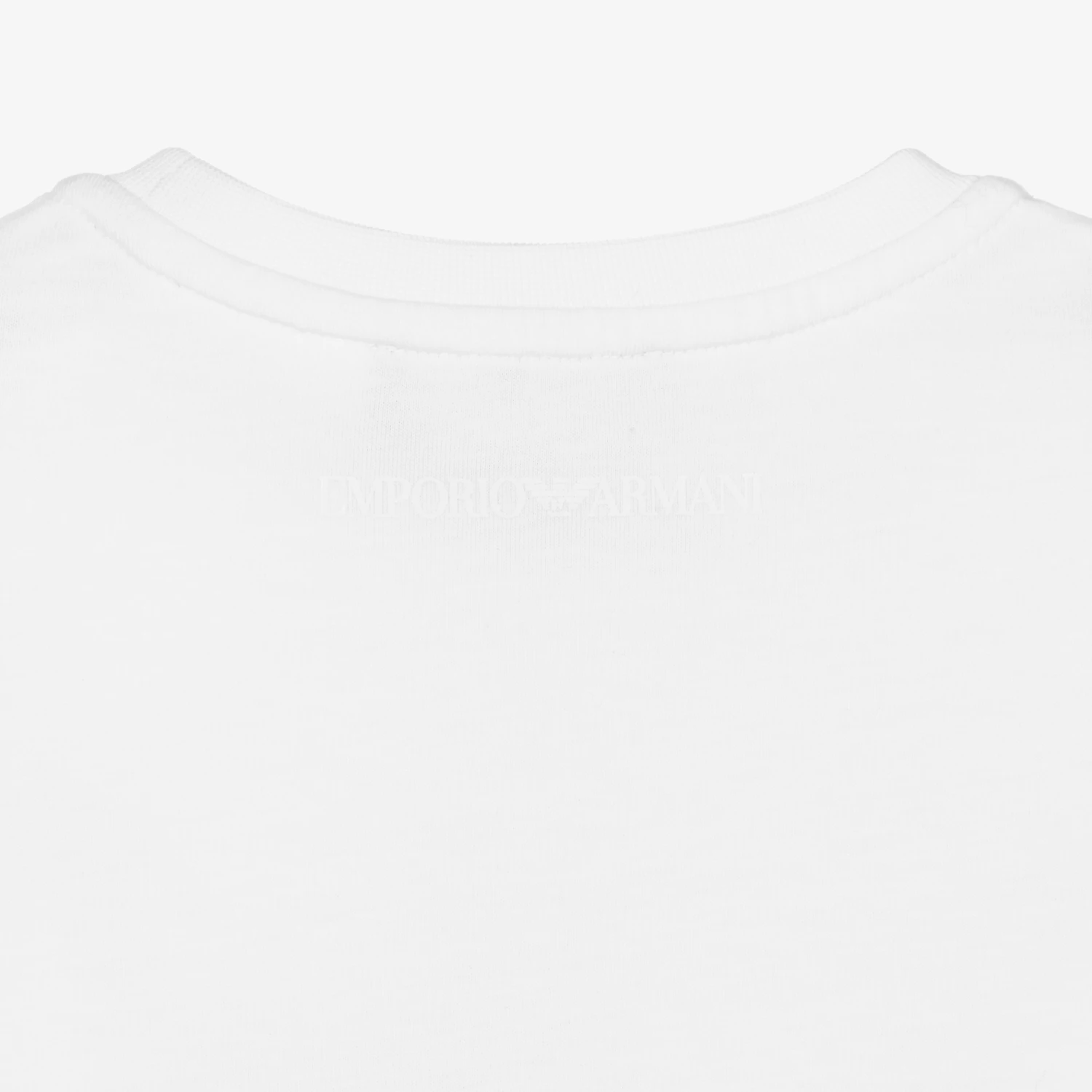 White T-shirt for girls by Emporio Armani, with a silver studded logo on the front. It is made in soft and comfortable cotton jersey.