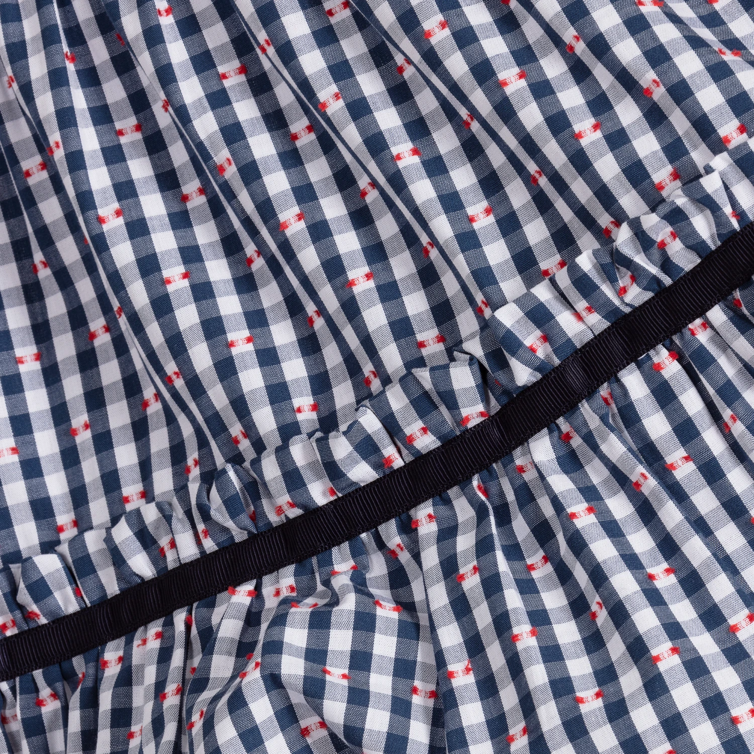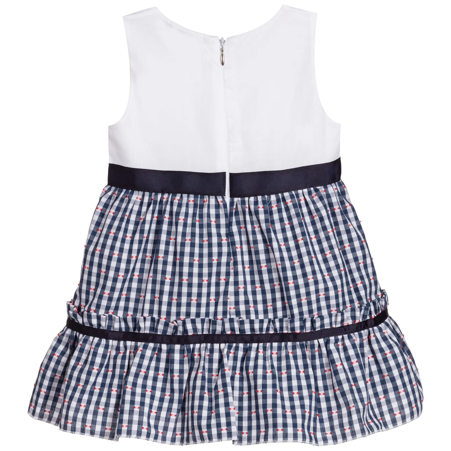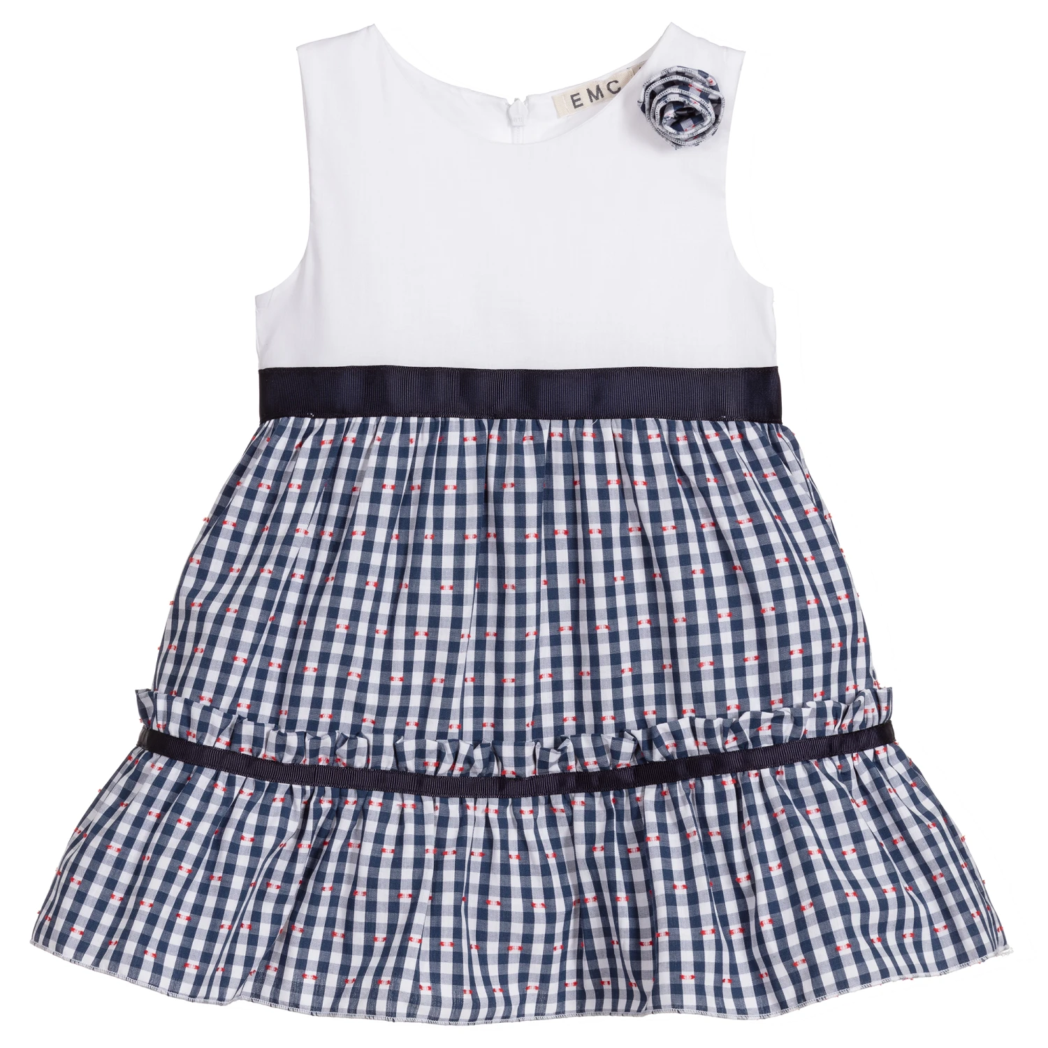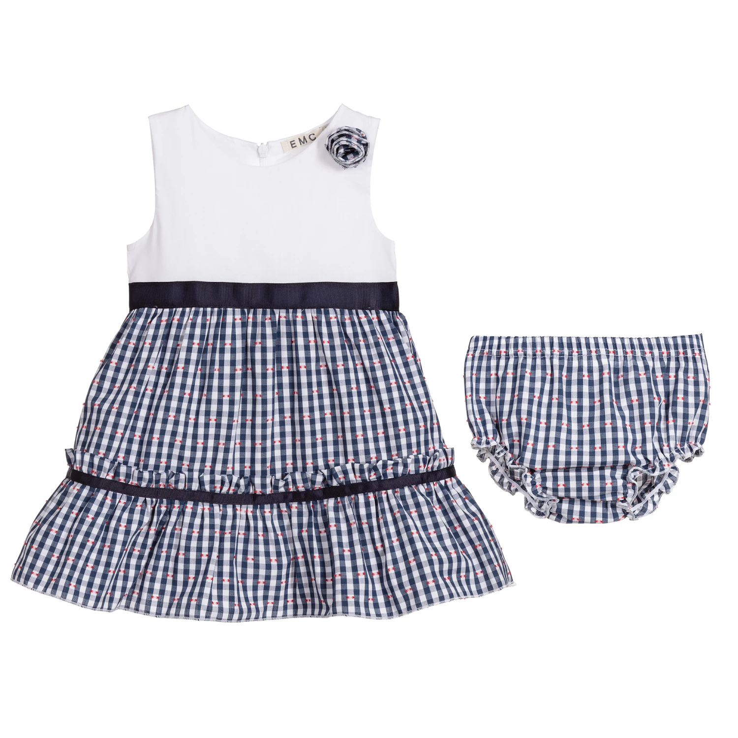 Baby girls beautiful dress set by Everything Must Change, made in lightweight polycotton. The dress has a white bodice with a blue check fabric flower to match the skirt. The gathered skirt has navy blue grosgrain trim and a frilled hem. Matching, elasticated knickers complete the outfit.