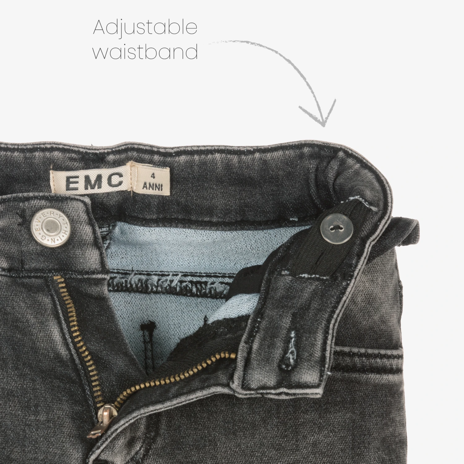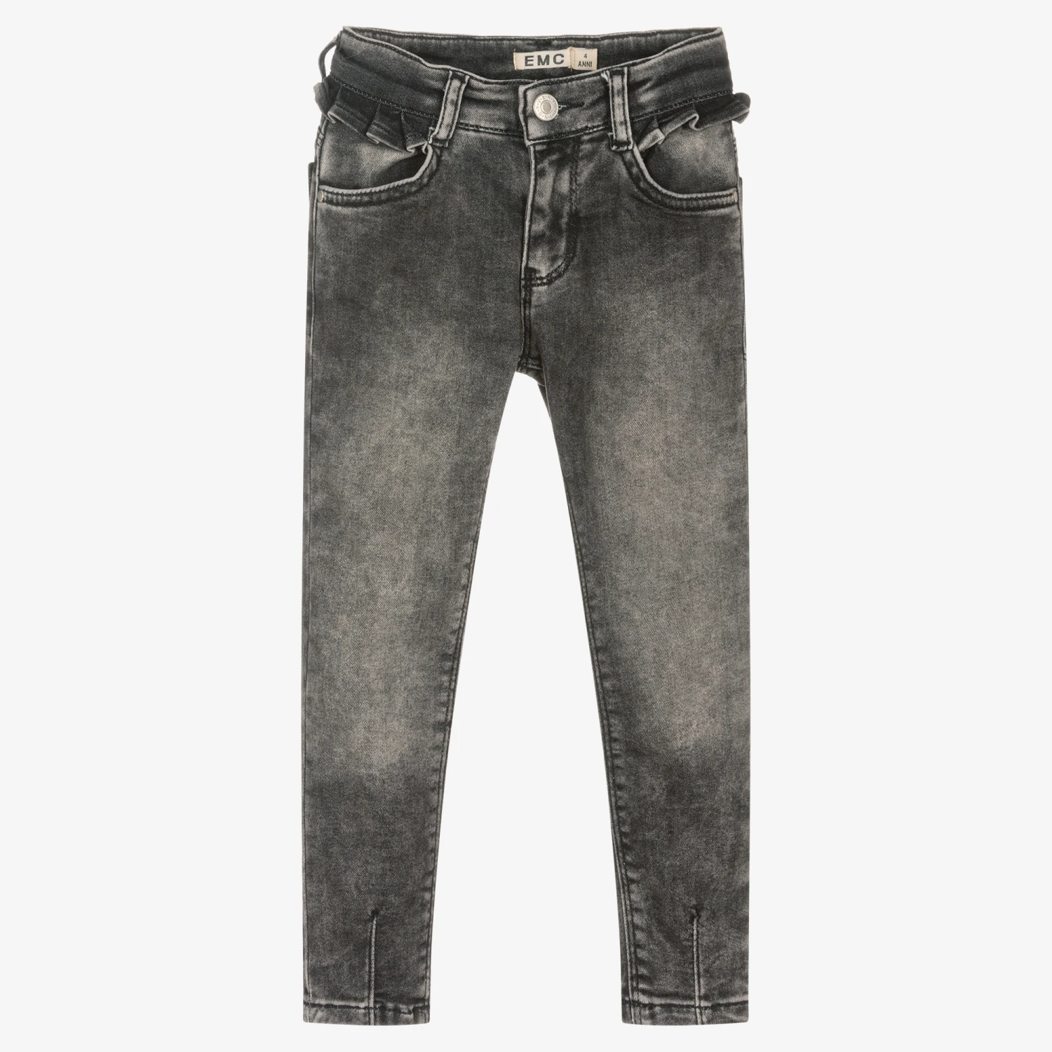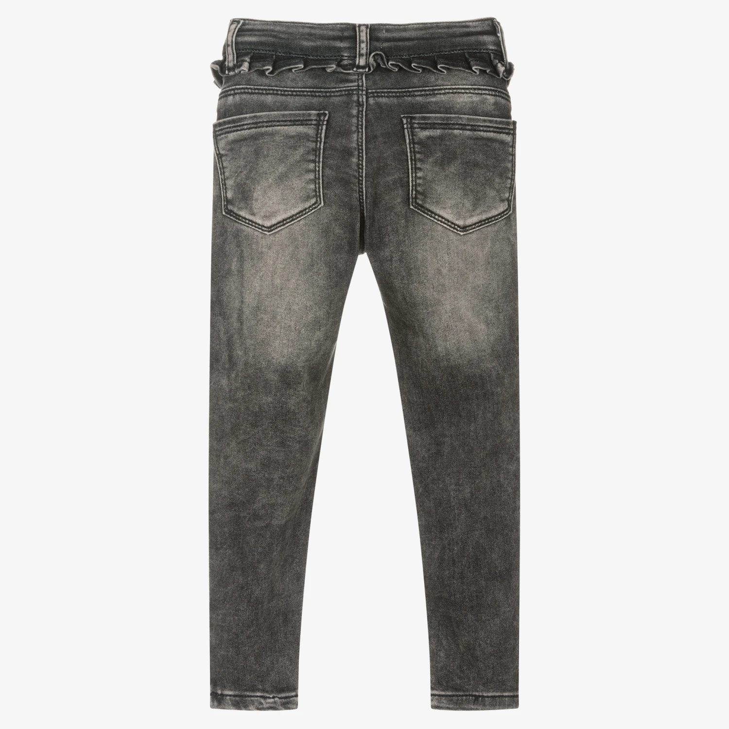 Girls black slim fit jeans by Everything Must Change, made in soft and stretchy denim jersey. They have a washed, faded finish and a pleated ruffle trim on the adjustable waist for a feminine touch. There are pockets on the front and back and the jeans fasten with a zip and branded button.
