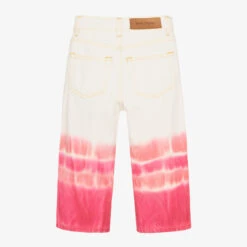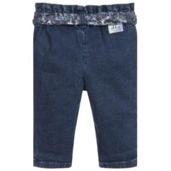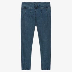 Blue jeans for girls by Everything Must Change, made in soft stretch denim. They have a worn and faded look, and are decorated with white studs on the front. There are front pockets, fixed turn ups, and the waistband is comfortably elasticated, with a button and zip fastening.
