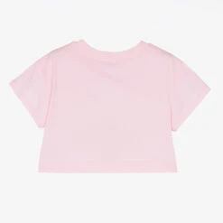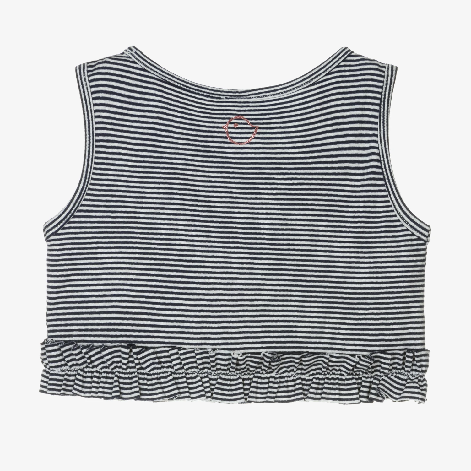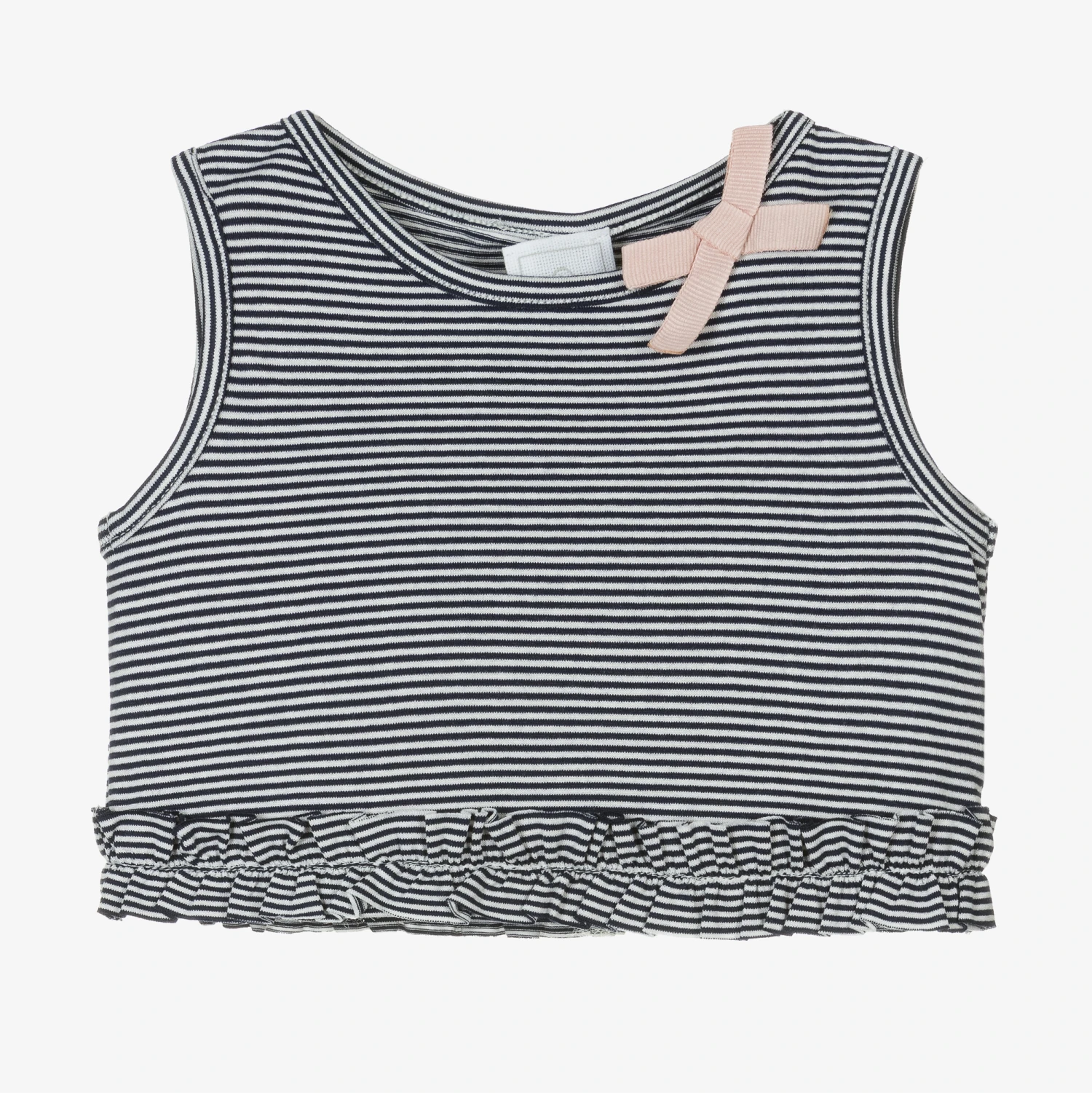 Navy blue and white striped top for little girls from Falcotto by Naturino, made in soft and stretchy viscose jersey. This comfortable sleeveless style has a pink grosgrain bow on the neckline and a pretty ruffled hem. To complete the look, the Italian brand’s Chick logo is printed on the back in glittery pink.