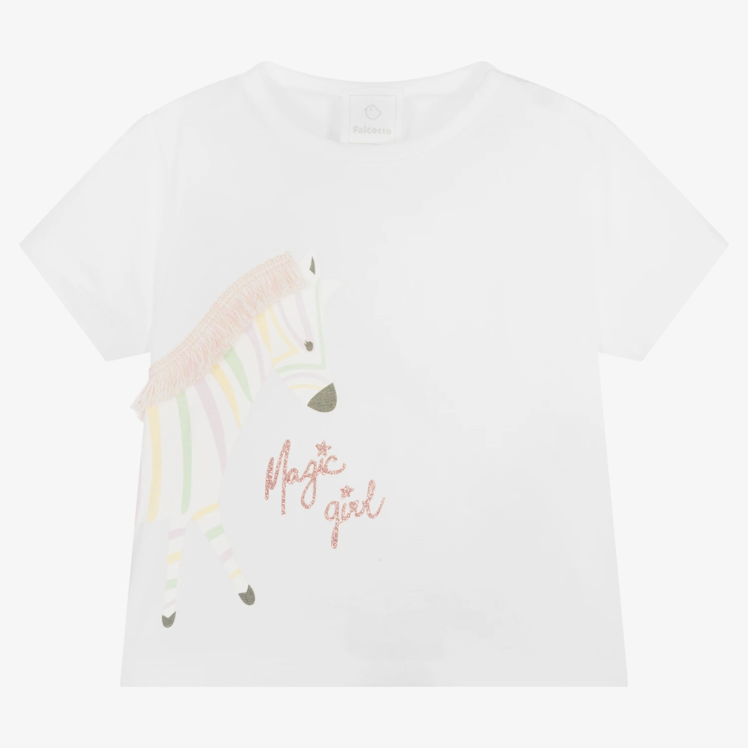 Pretty white T-shirt for little girls from Italian brand Falcotto by Naturino, made in soft cotton jersey. It has a cute pastel-coloured zebra printed on the front, with a pink and ivory fringe mane and the words ‘Magic Girl’ in pink glitter. There are useful popper fastenings on one shoulder to help with dresseing and the brand’s cute chick logo is printed on the back in white glitter for a discreet designer finish.