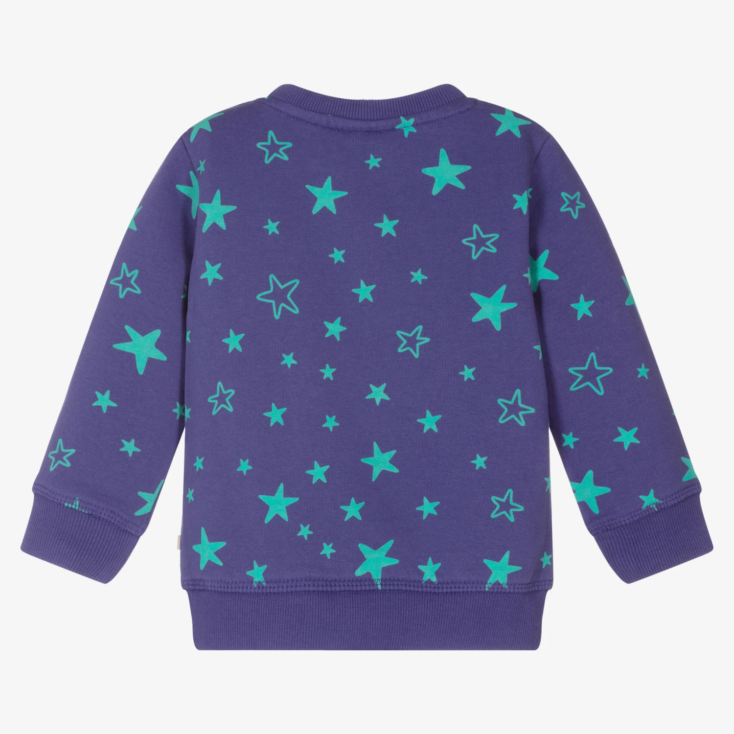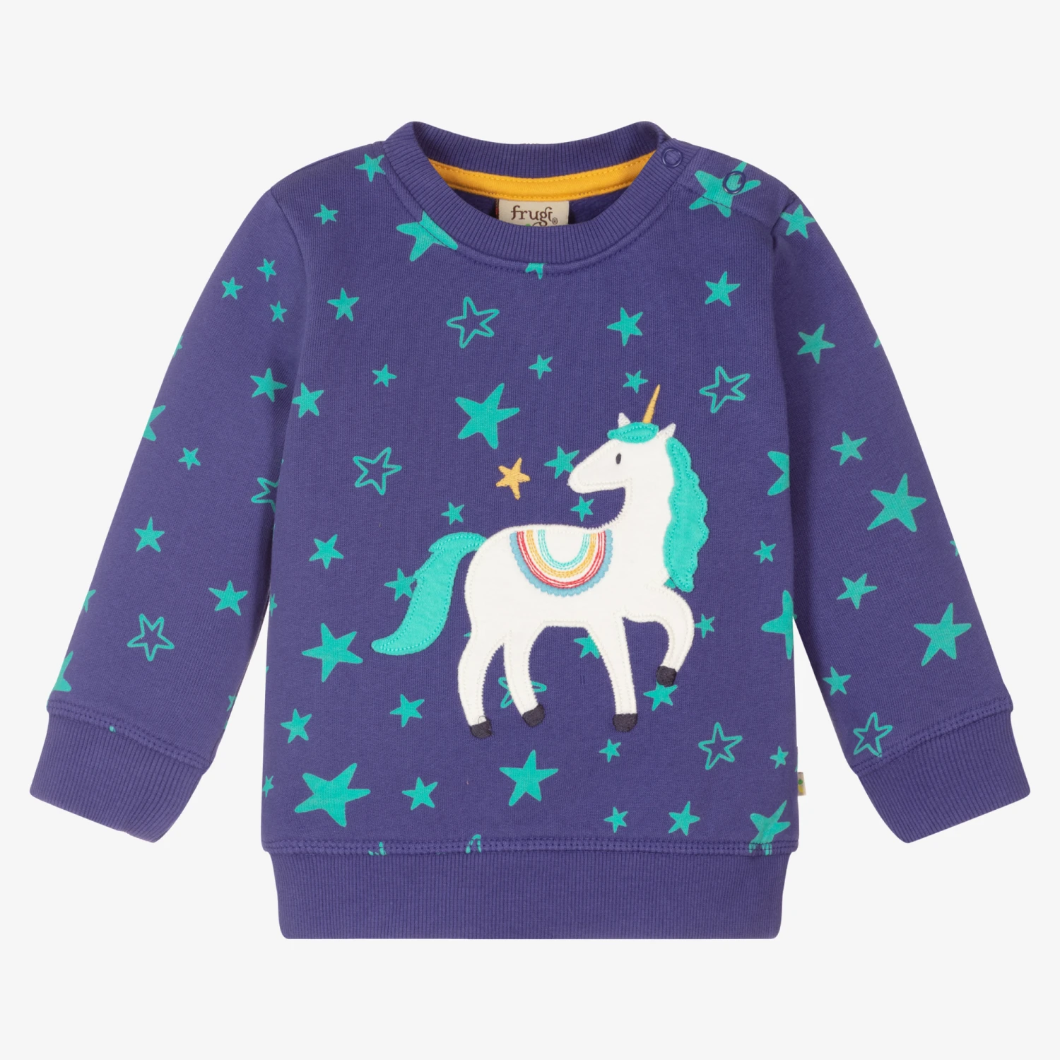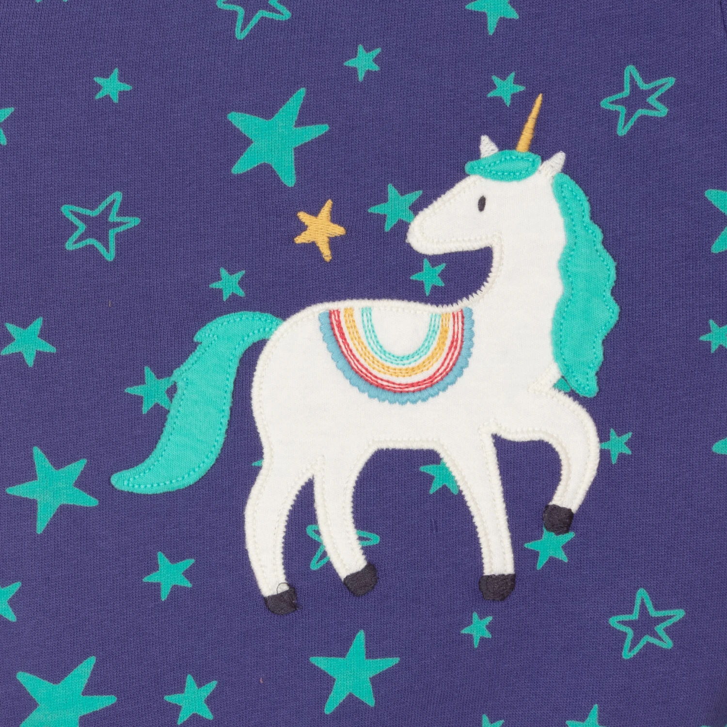 Indigo blue sweatshirt for girls and boys by British brand Frugi, made in soft organic cotton jersey with a fleecy inside. With a printed green star pattern all-over, the front is trimmed with a large white and green unicorn appliqué.
