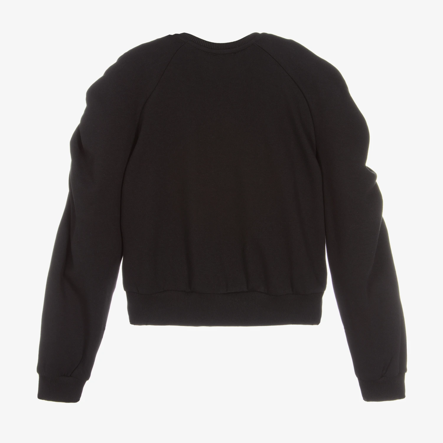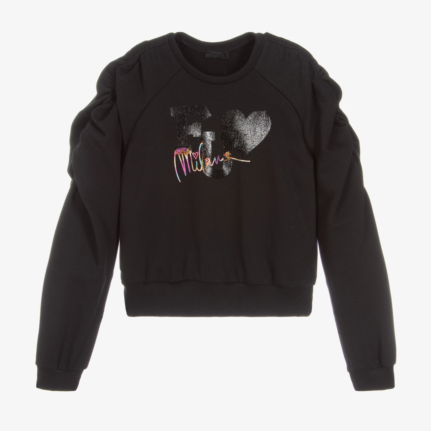 Black cotton sweatshirt for girls by Fun & Fun. This comfortable top has ruched shoulders on the long sleeves and ribbed trims. There is a shiny black and multicoloured logo printed on the front.
