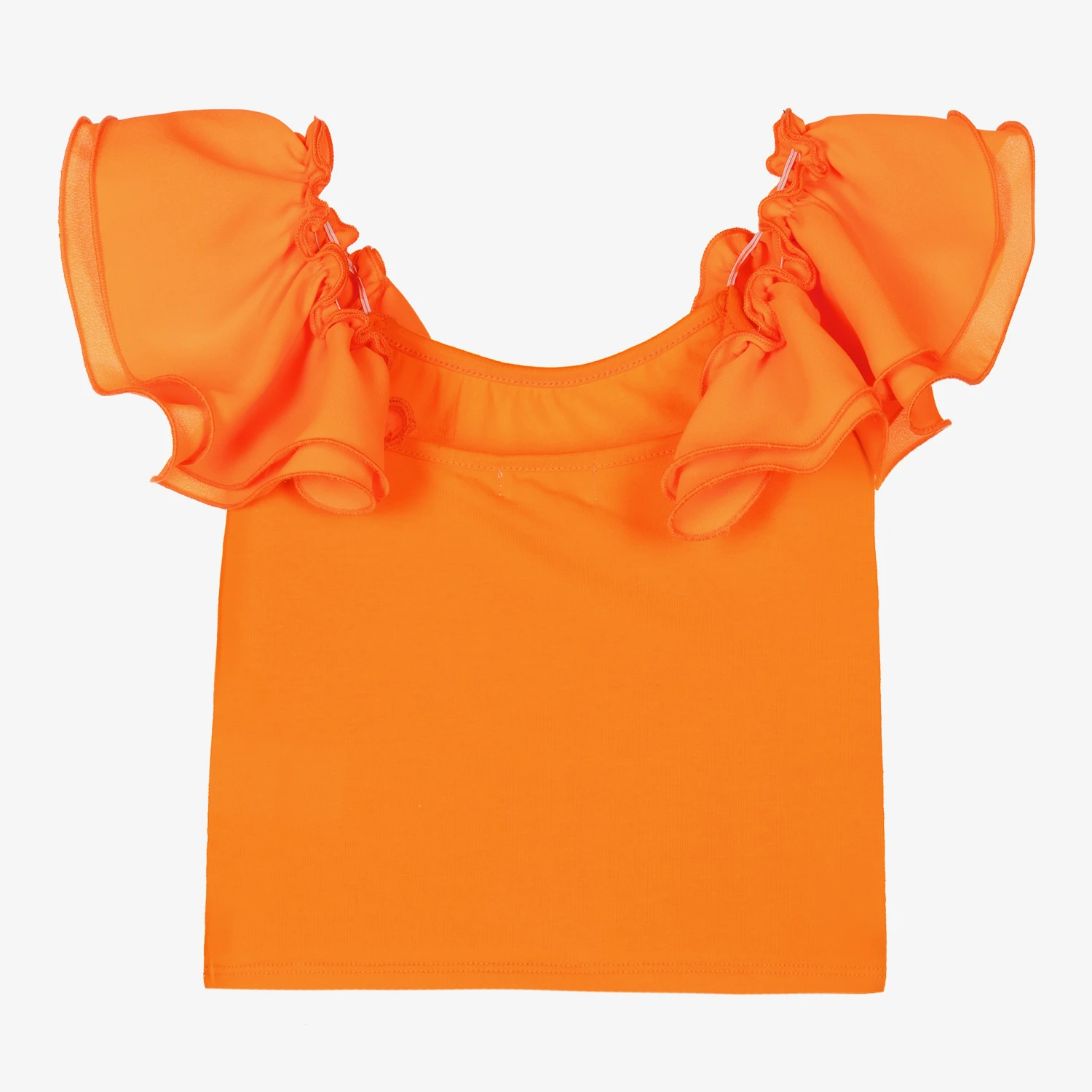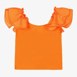 Pretty blouse for girls by Fun & Fun, in a bright orange shade. Striking and summery, it has gorgeous ruffle trimmed sleeves and is made in soft cotton jersey for style and comfort.