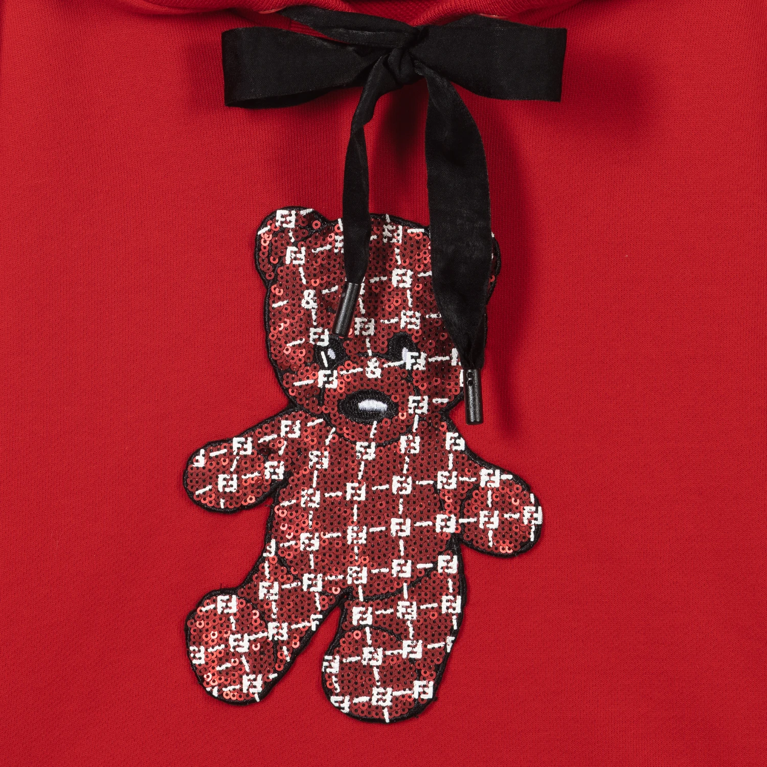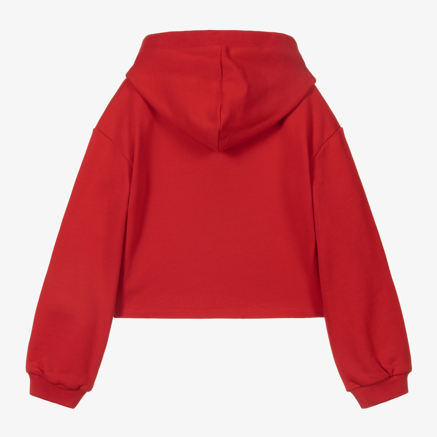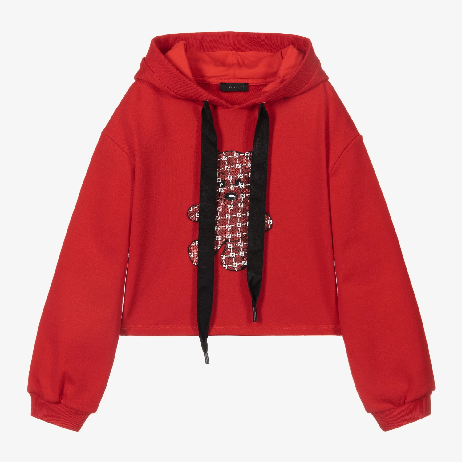 Made in mid-weight cotton jersey, this girls red cropped hoodie by Fun & Fun. It has a red and white branded sequin bear applique on the front and long black satin drawstring cords on the hood.