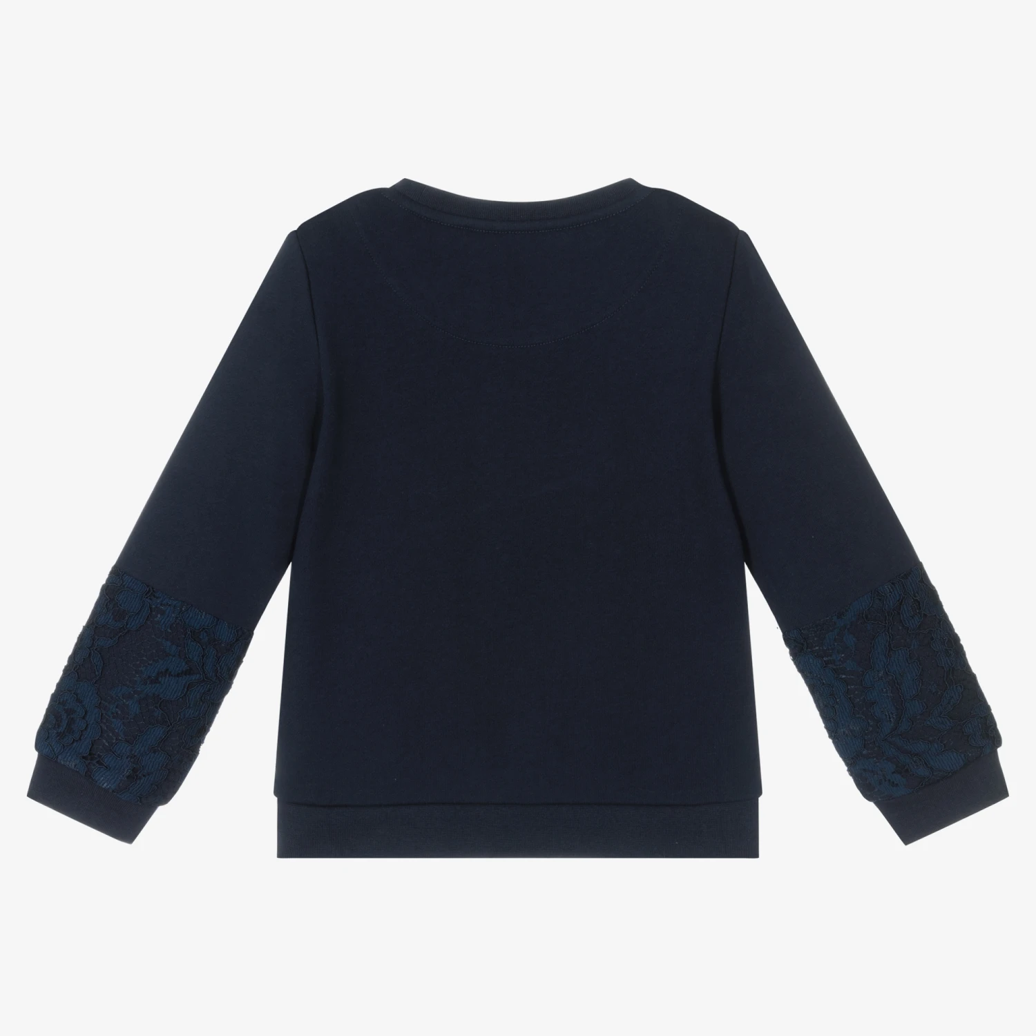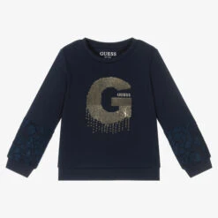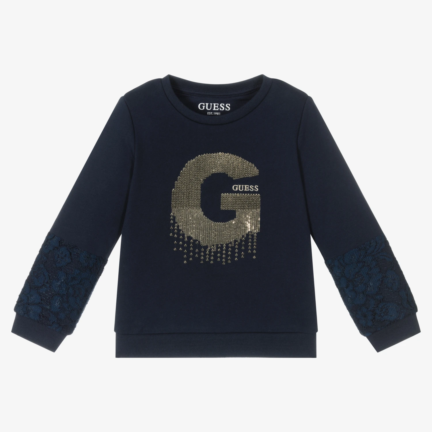Navy blue sweatshirt for younger girls by Guess, with a gold sequin logo and embroidery on the front. Made in midweight jersey, it has lace panels on the sleeves.